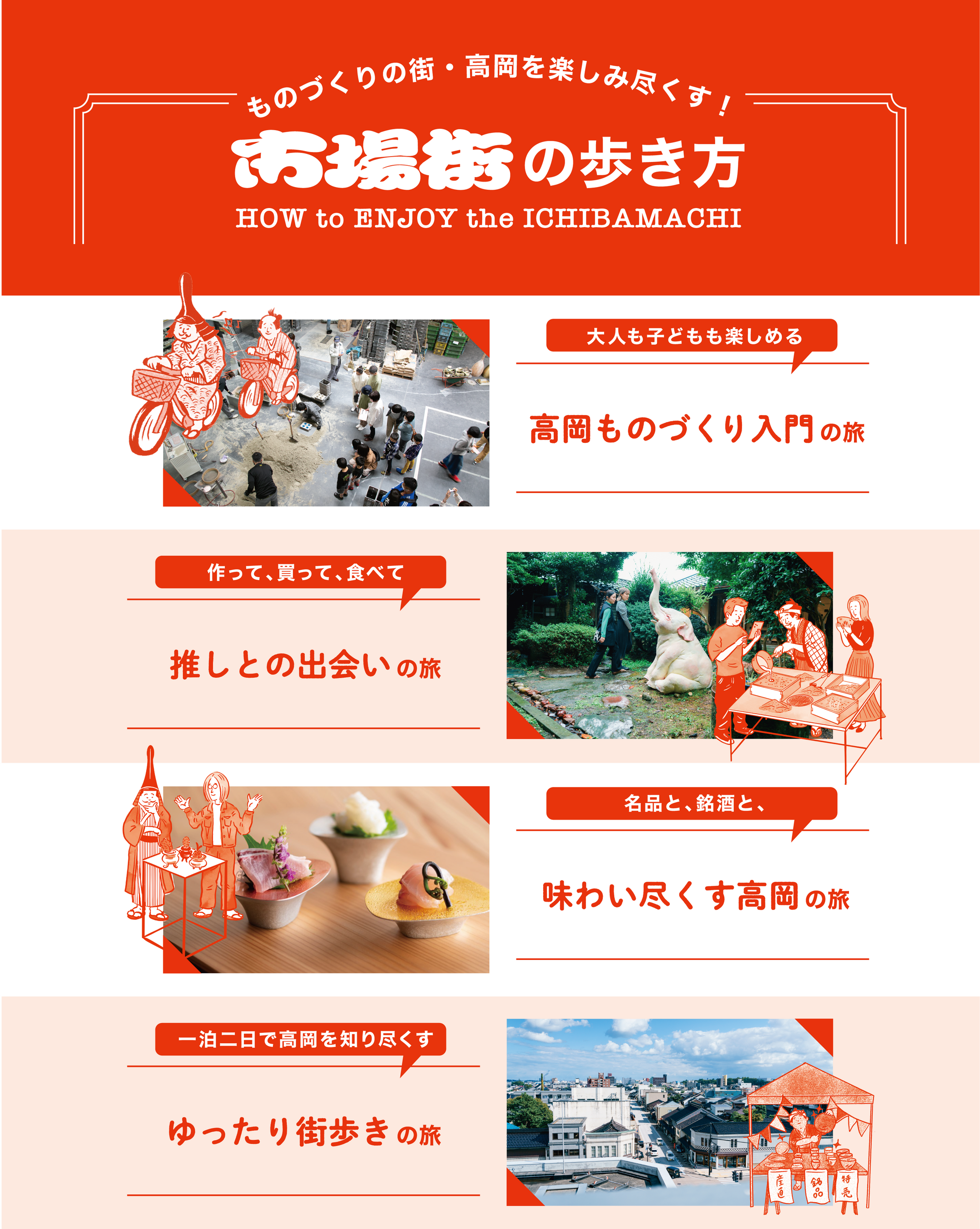 今年はクラフト&アートの展示、職人のオープンファクトリー、まちグルメなど例年にも増して幅広いコンテンツが散りばめられた高岡のまちを巡る「手仕事のまち巡り」がポイントです。ホームページにて「市場街の歩き方」とおしておすすめの4つのモデルプランを紹介しています。