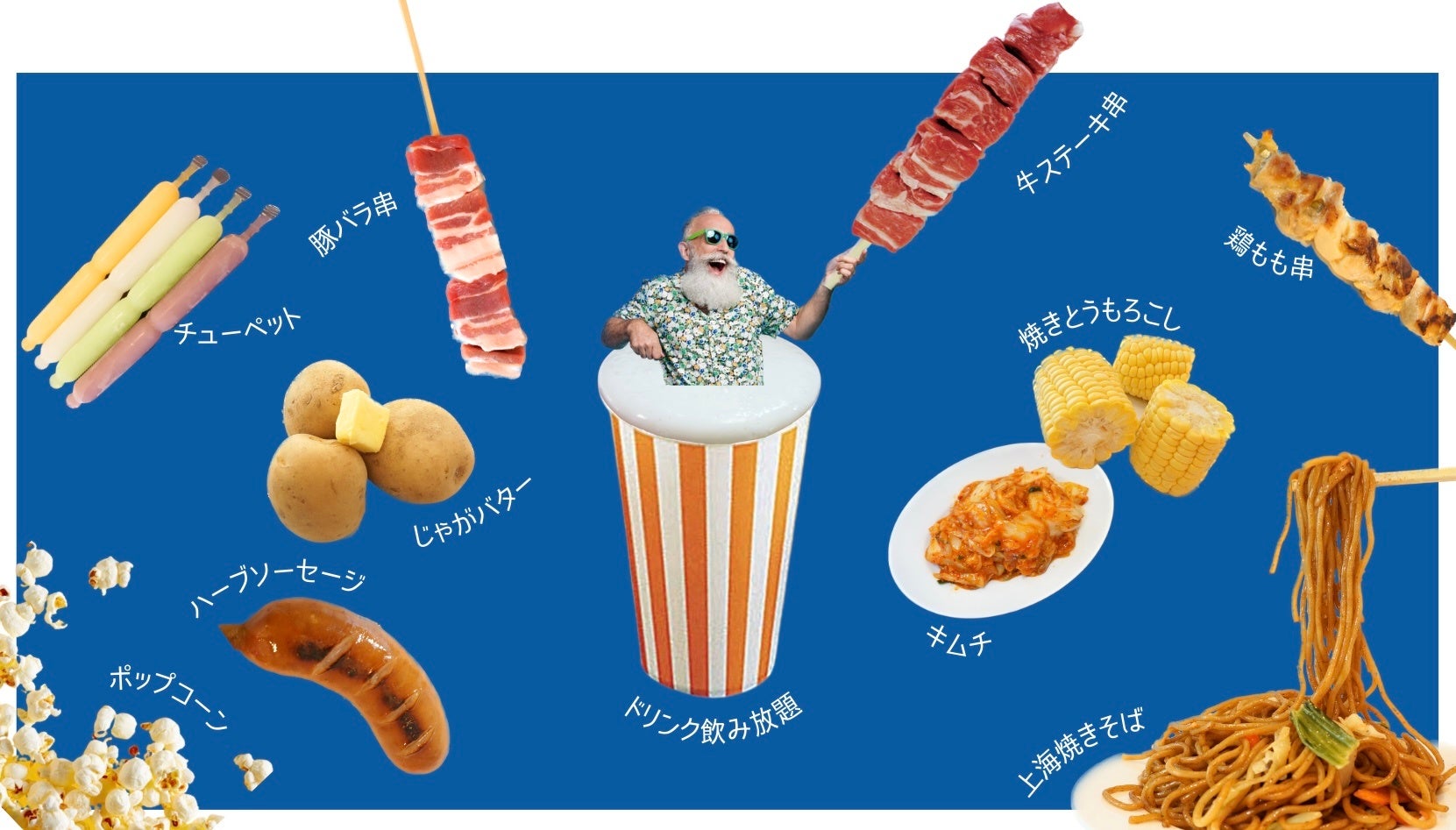 鶏もも串、豚バラ串、牛ステーキ串、ハーブソーセージ、ポップコーン、枝豆、キムチ、じゃがバター、焼きとうもろこし、上海焼きそば、チューペット、ニンニク醤油ソース、塩レモン
