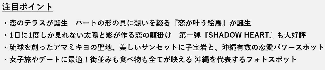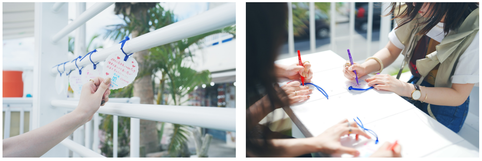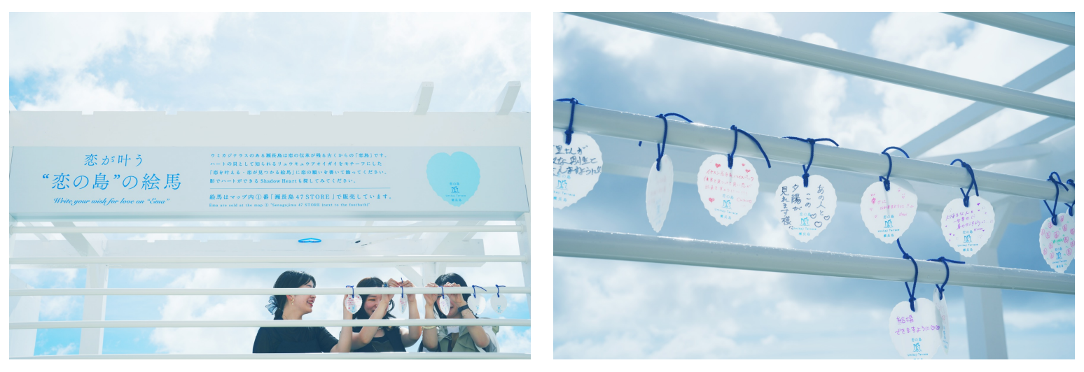 また、瀬長島の南東部には「子宝岩」があり、まだ島民が島に住んでいた時代には子宝祈願に必ず訪れていたとされており、さらに実際にプロポーズを成功させたり、子宝に恵まれたという声も多数いただいている「恋の島」です。そんな「恋の島」にハートの形の貝をあしらった新たな“恋のおまじない” 『恋が叶う絵馬』が「恋のテラス」に誕生しました。