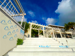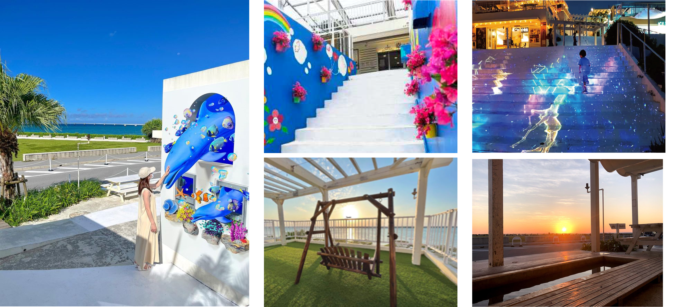 左斜め後方から撮影すると、イルカが飛び出しているように見えるトリックアート『幸せを呼ぶイルカ』や、真っ青な壁と豊見城市花のブーゲンビリアで彩られた鮮やかな幸せを呼び込む空間『ブーゲンビリアの階段』など、様々な映えるフォトスポットが集まる瀬長島ウミカジテラス。