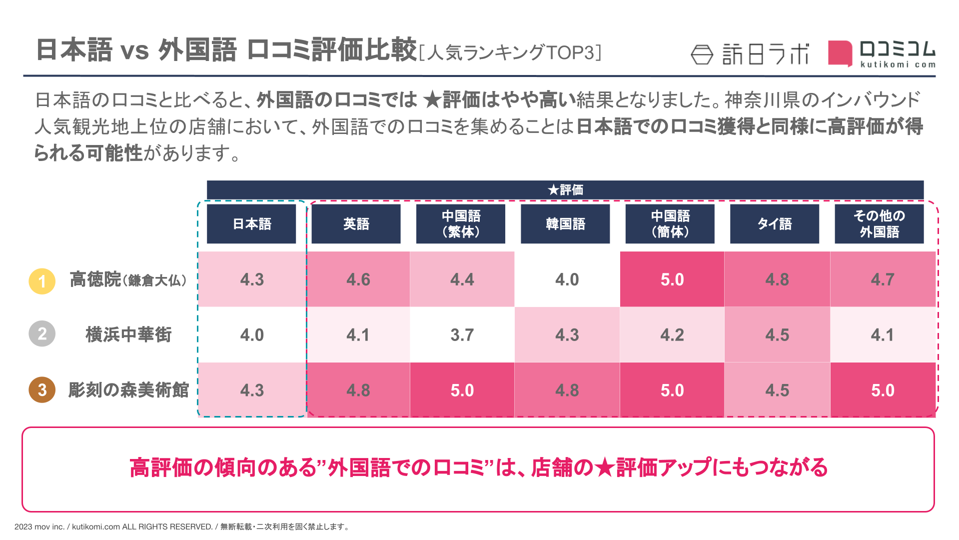日本語の口コミと比べると、外国語の口コミでは ★評価は同程度〜やや高い結果となりました。神奈川県のインバウンド人気観光地上位の店舗において、外国語での口コミを集めることは日本語での口コミ獲得と同様に高評価が得られる可能性があります。