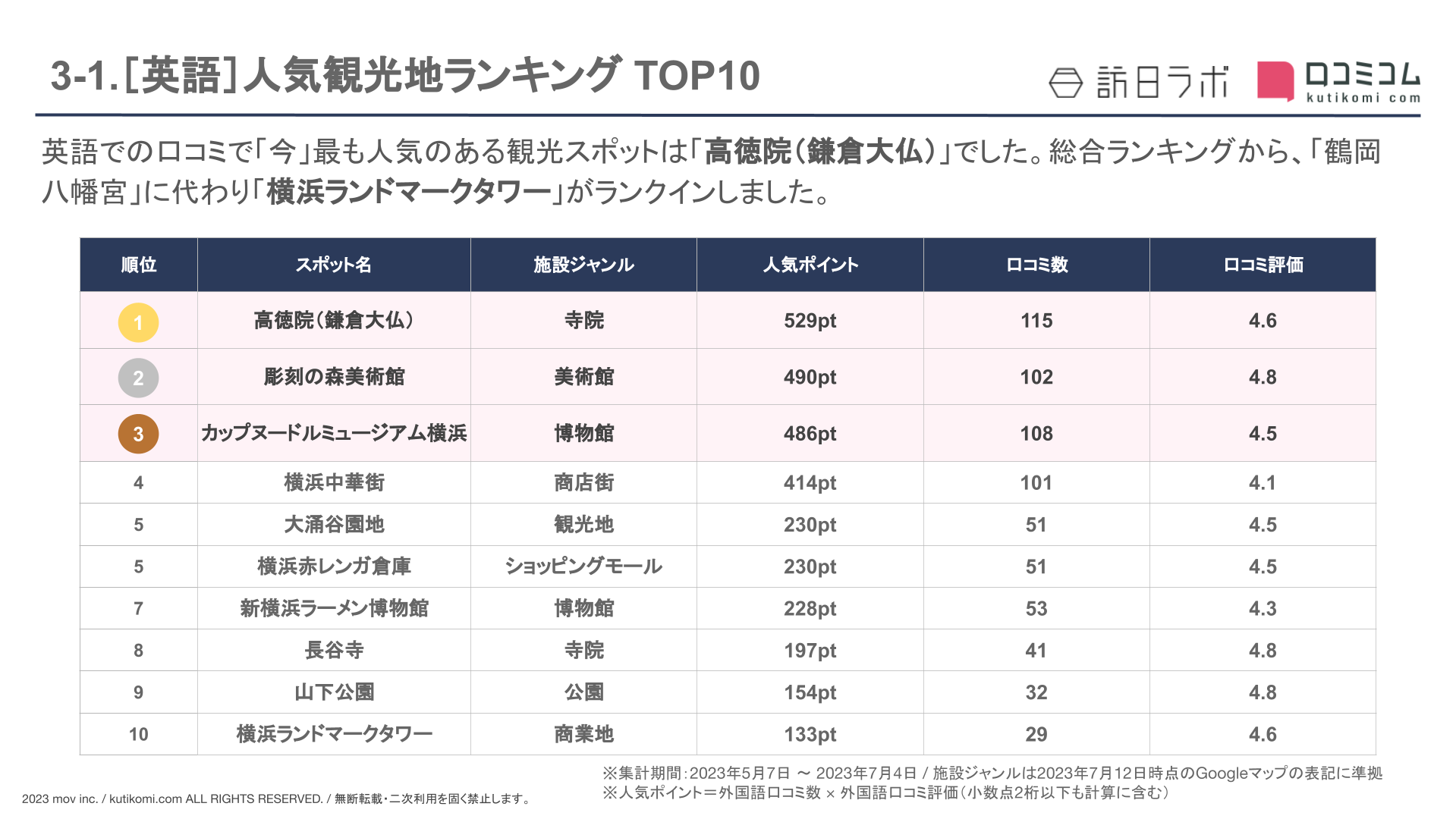 英語での口コミで「今」最も人気のある観光スポットは「高徳院(鎌倉大仏)」でした。総合ランキングから、「鶴岡八幡宮」に代わり「横浜ランドマークタワー」がランクインしました。