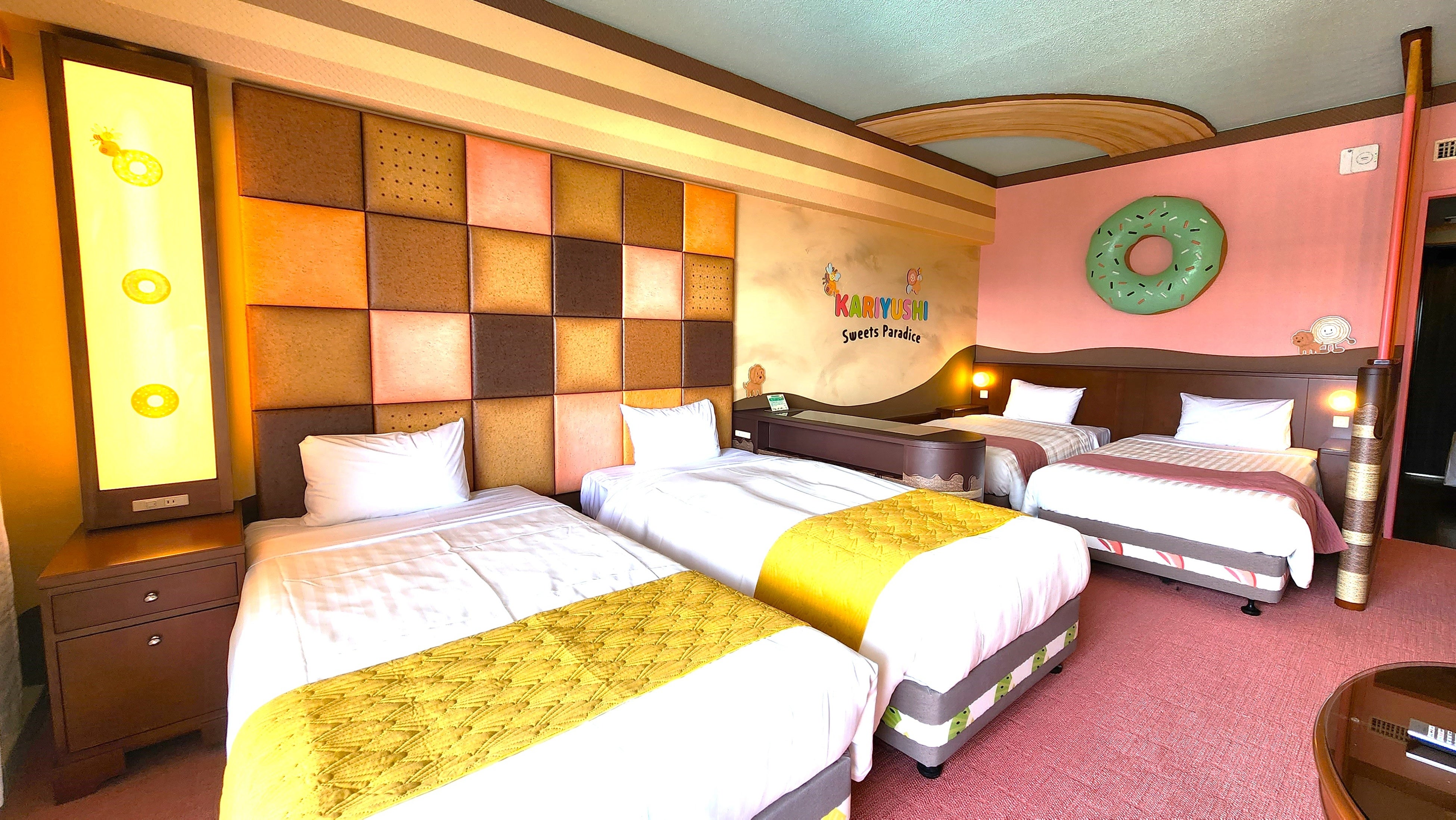昨年7月にオープンしたファミリールーム「やんばるの森」「やんばるの海」に引き続き、新たに2部屋の改修をさせていただきました。今回は、誰もが一度は憧れるお菓子の家をイメージして『天使のスイーツパラダイス』というコンセプトにしました。ただお菓子に見えるだけでなく美味しそう~!と思わず笑顔になってしまうような空間を追求しました。天井から家具の一部まで沖縄特産であるマンゴー、紅芋や黒糖などを使ったスイーツの装飾がちりばめられています。沖縄のご当地スイーツを食べた幸せな想い出に浸れるような空間にデザインしました。※宿泊のご予約は沖縄かりゆしビーチリゾート・オーシャンスパへお問い合わせください。