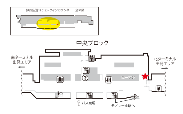北ターミナル(JALチェックインカウンター側)を背に、コンビニエンスストア「ローソン」横への設置となります。