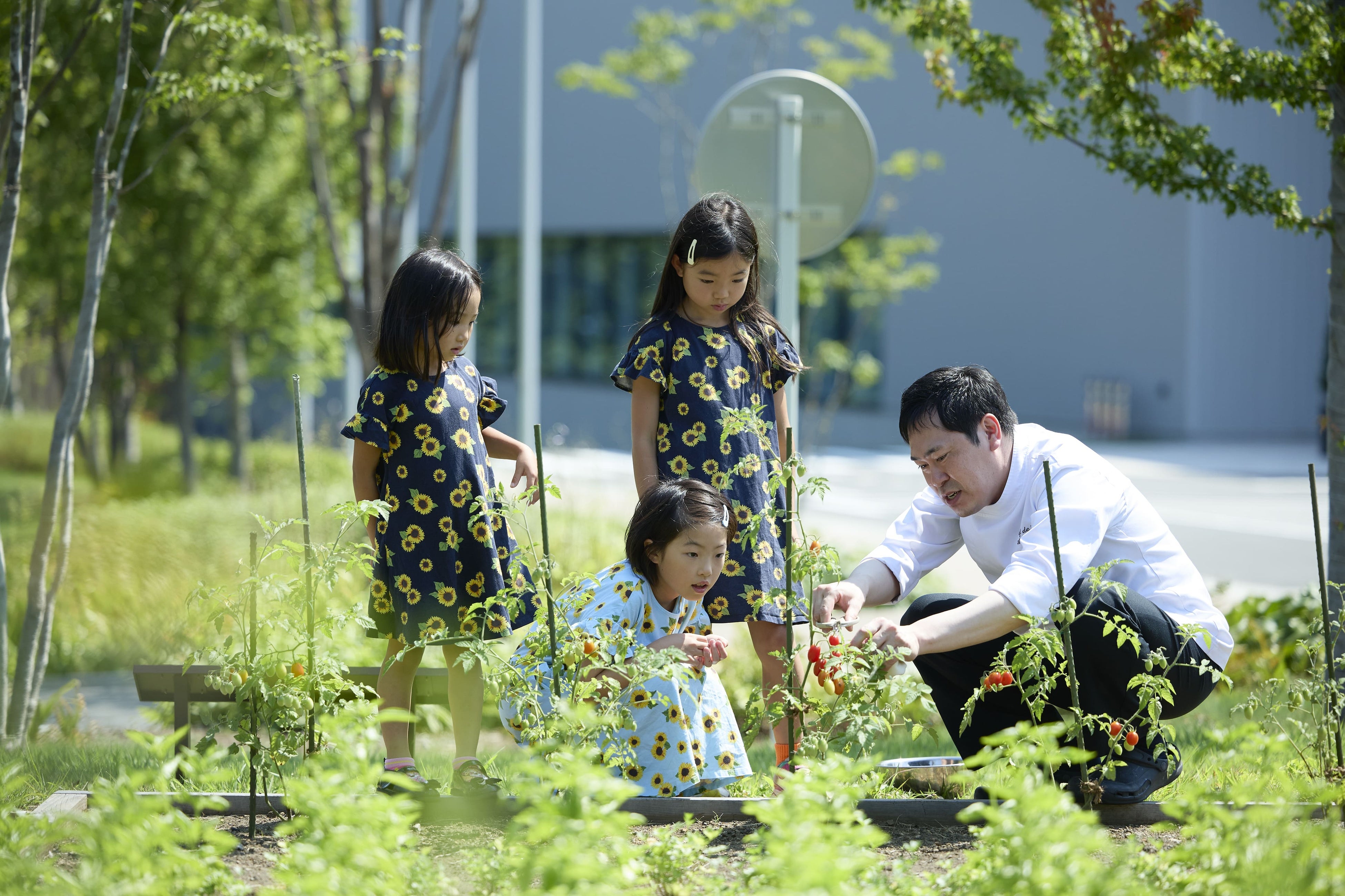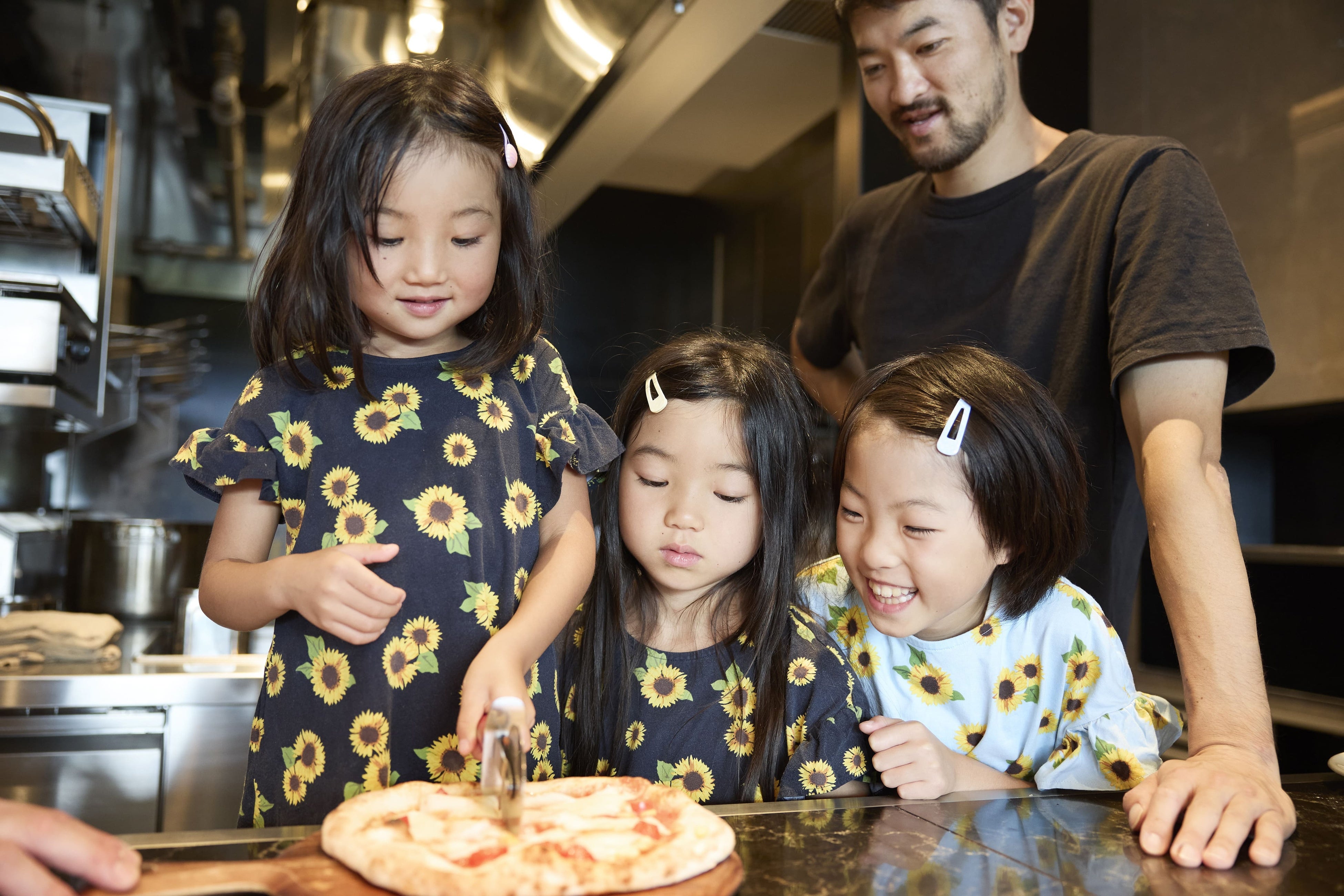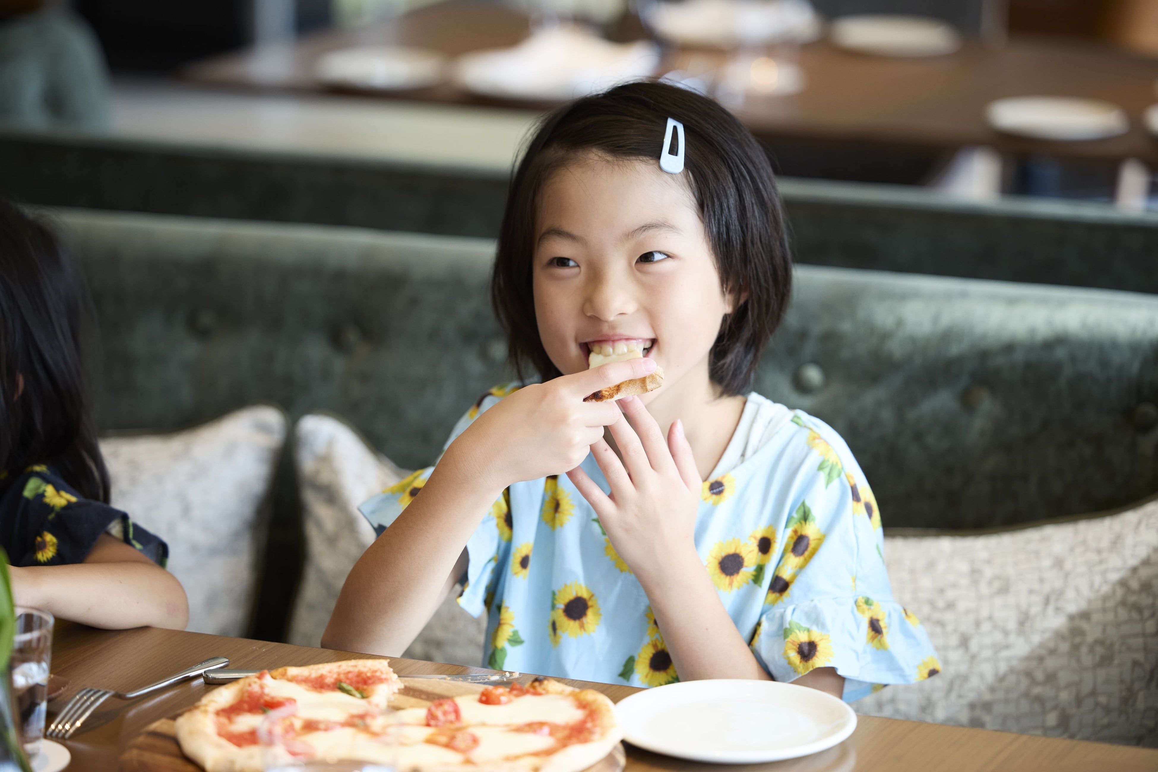 本格石窯で焼くピザが人気の「TROFEOイタリアン」では、本格的なナポリピザを楽しく学べるピザ教室を開催いたします。ホテルの敷地内の「シェフズガーデン」と呼ばれる畑で大切に育てられているバジルやディルなど5種類のハーブをシェフと一緒に収穫し、SDGsの目標のひとつである「つくる責任 つかう責任」を体験します。お子様にはよい食育の機会にもなるでしょう。ハーブを収穫した後は、レストランにて熟練シェフの指導のもと、地元農家で栽培された夏野菜やコーン、ツナ、ハムなどをトッピングしていきます。チーズには、総料理長の石井順が「食べる牛乳」と絶賛する富士山の麓で生産される美味しい牛乳と水から作られる七富チーズ工房のモッツァレラチーズをたっぷりとのせます。ピザは400℃近くにまで上がる本格的な焼き窯に入れられ、シェフが最適なタイミングで取り出します。お席でお好きなソフトドリンクと共に焼きたてのオリジナルピザをお楽しみください。