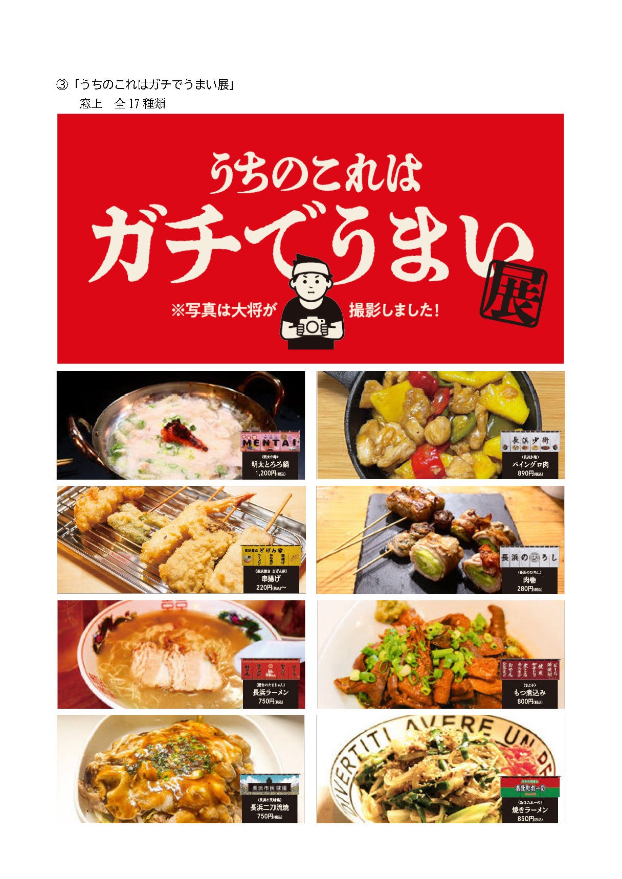 ③店主自身が料理の撮影をした「うちのこれはガチでうまい展」(窓上)