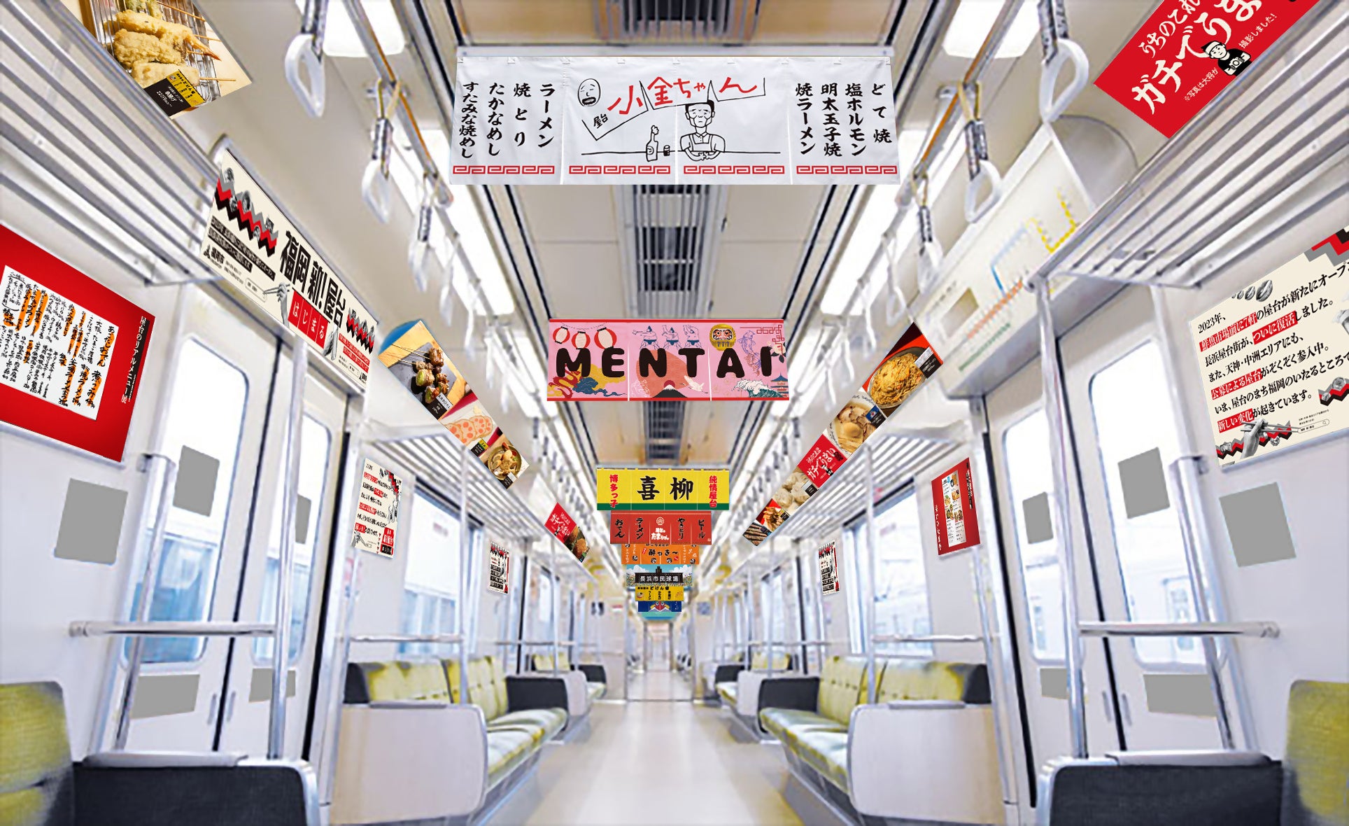 駅から徒歩圏内の、天神・中洲・長浜の3大屋台街から計45軒の屋台が、車両内に“出店”します。