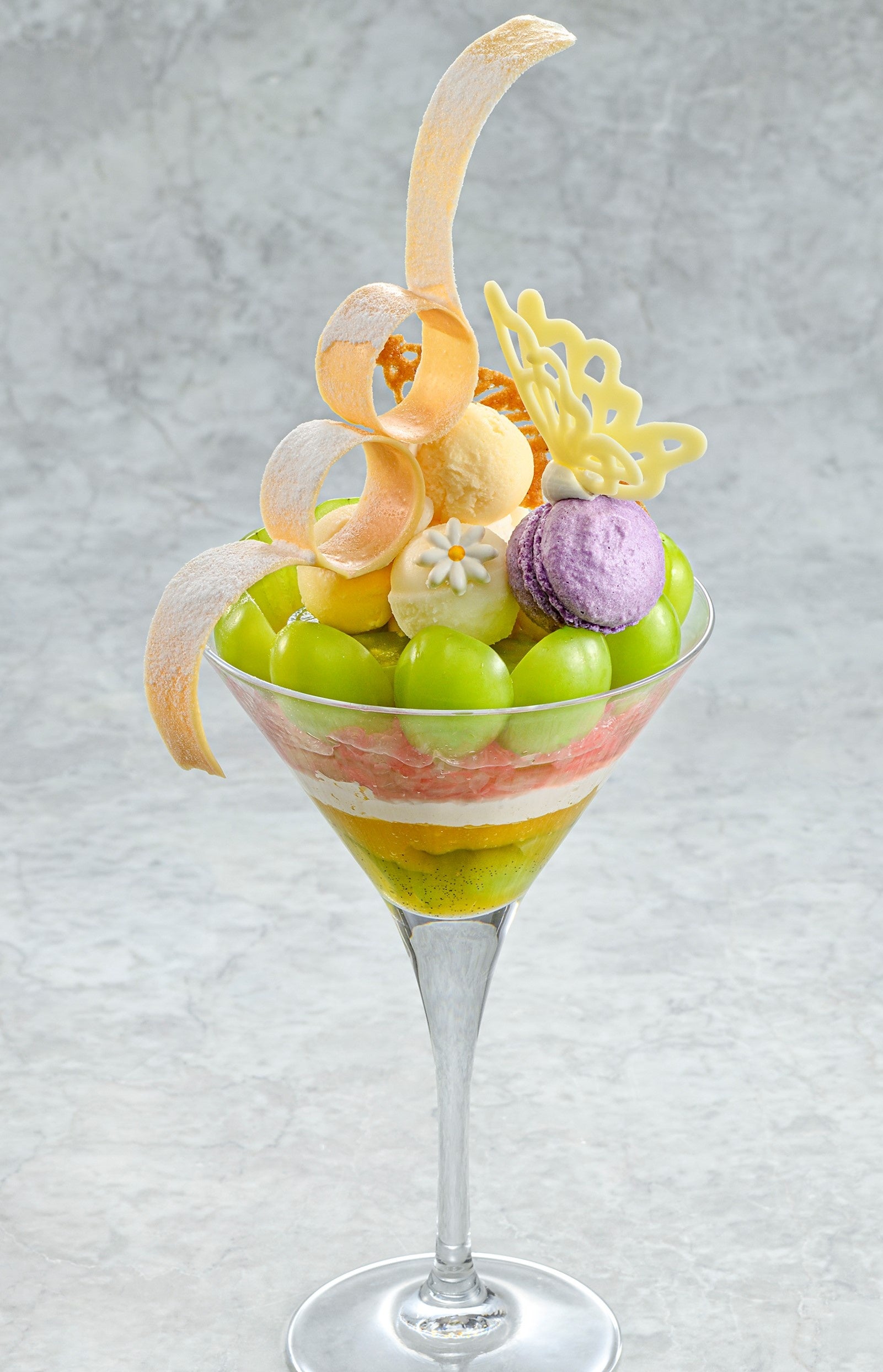 グラスの一面には、芳醇で新鮮なシャインマスカットを贅沢に盛り付け、最下層にはオリーブオイルに漬けたシャインマスカットが隠れています。オリーブオイルがシャインマスカットの爽やかな甘みに深みをもたせ、異なる味わいをお楽しみいただけるパティシエこだわりのポイント。そのほか、ココナッツアイスミルクやグレープフルーツ、マンダリンジュレなど彩りを重ね、食べ進める度に変化する味わいをお楽しみいただけます。