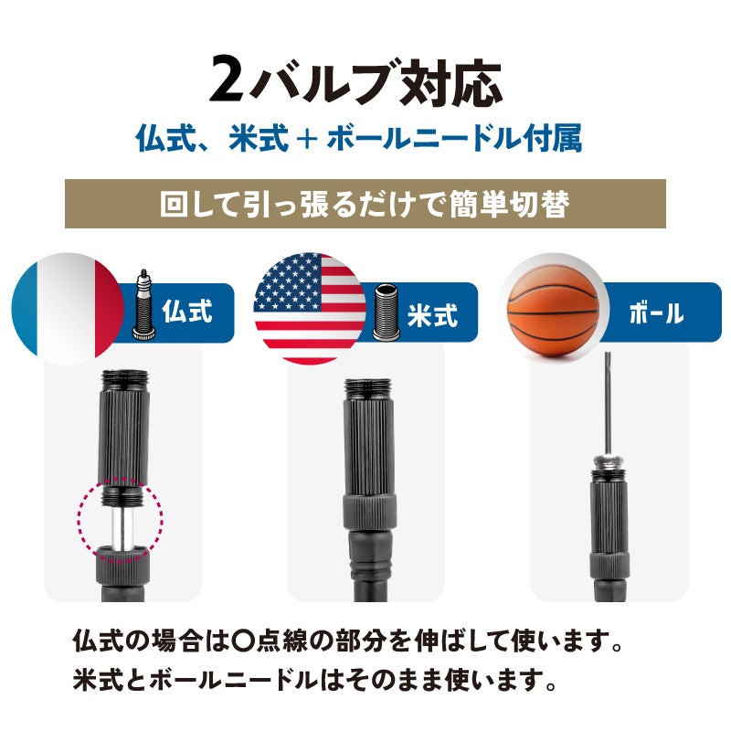仏式(フレンチバルブ)と米式バルブにプラスでボールニードルが付属しています。