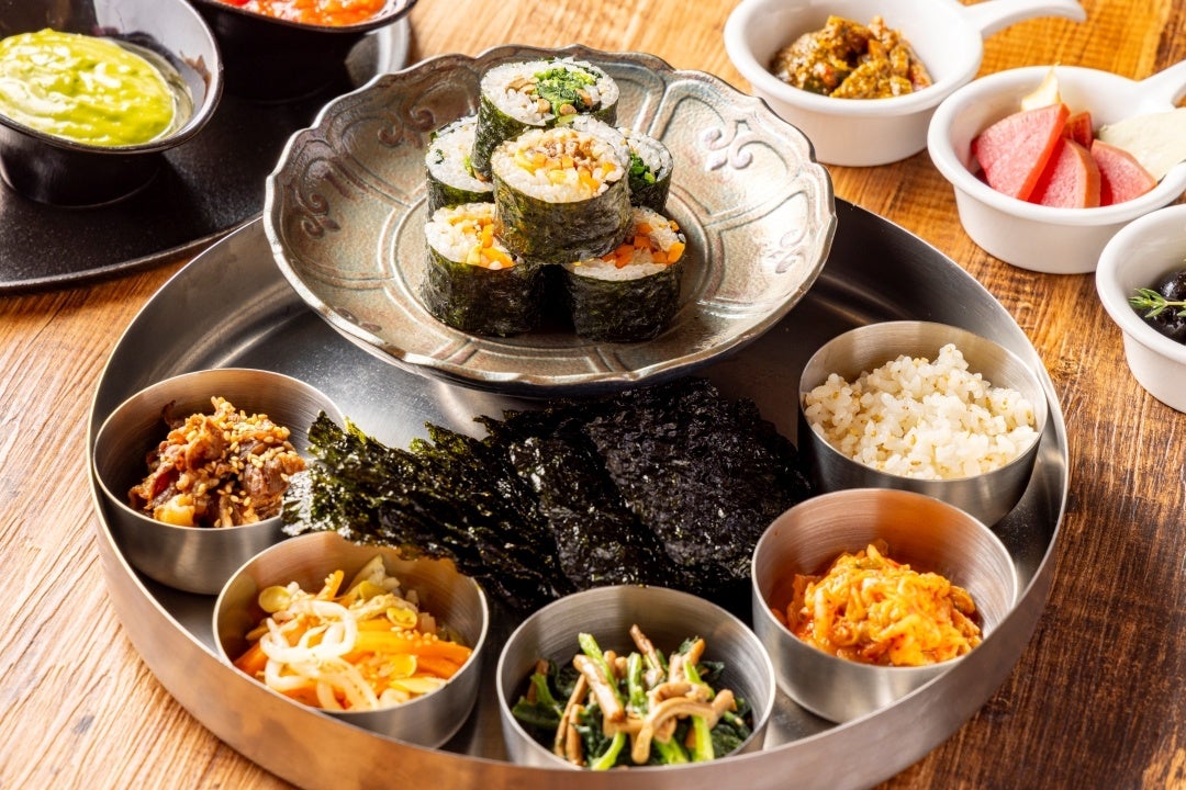 スギモト焼肉のタレでプルコギ風に炒めた牛肉やキムチ、ナムルなどお好みの具材を、味付けしたご飯と韓国海苔で巻いてお楽しみください。
