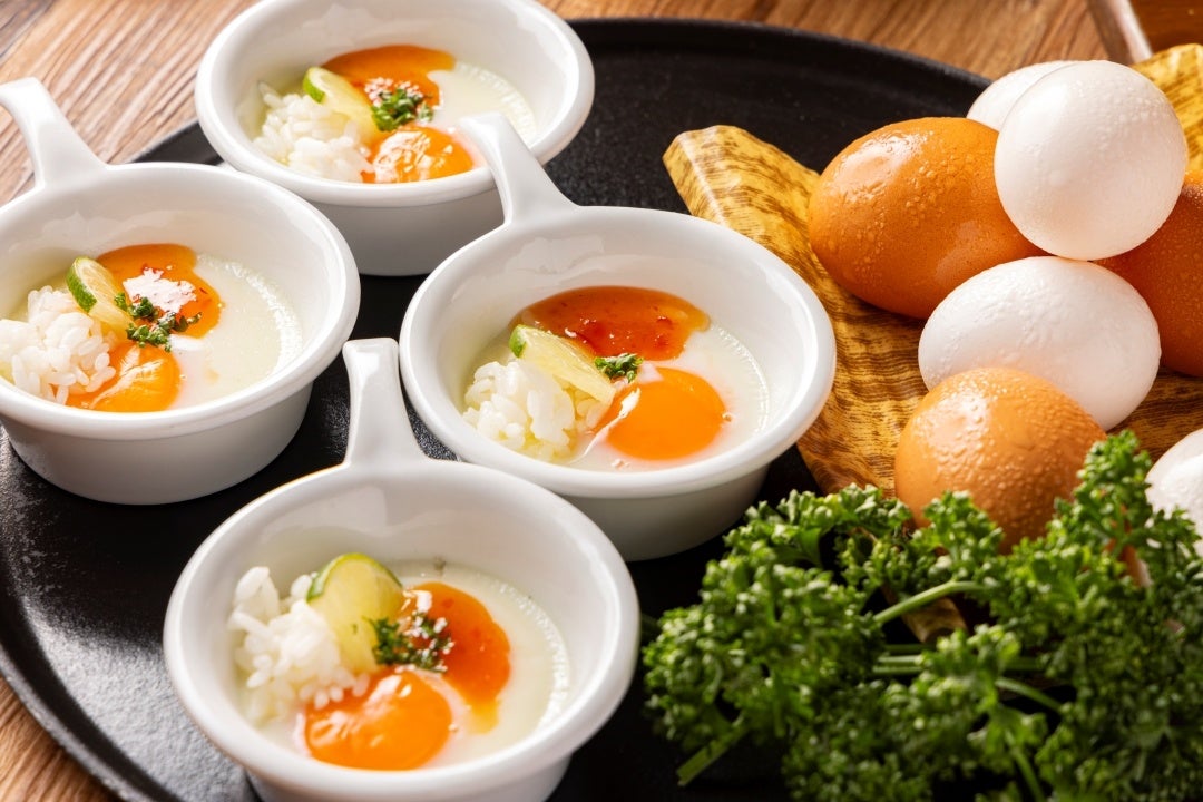 ココットで半熟に蒸し焼きにした卵に、マレーシア風の生姜の効いたチキンライスを添え、甘味のあるチリソースをかけました。