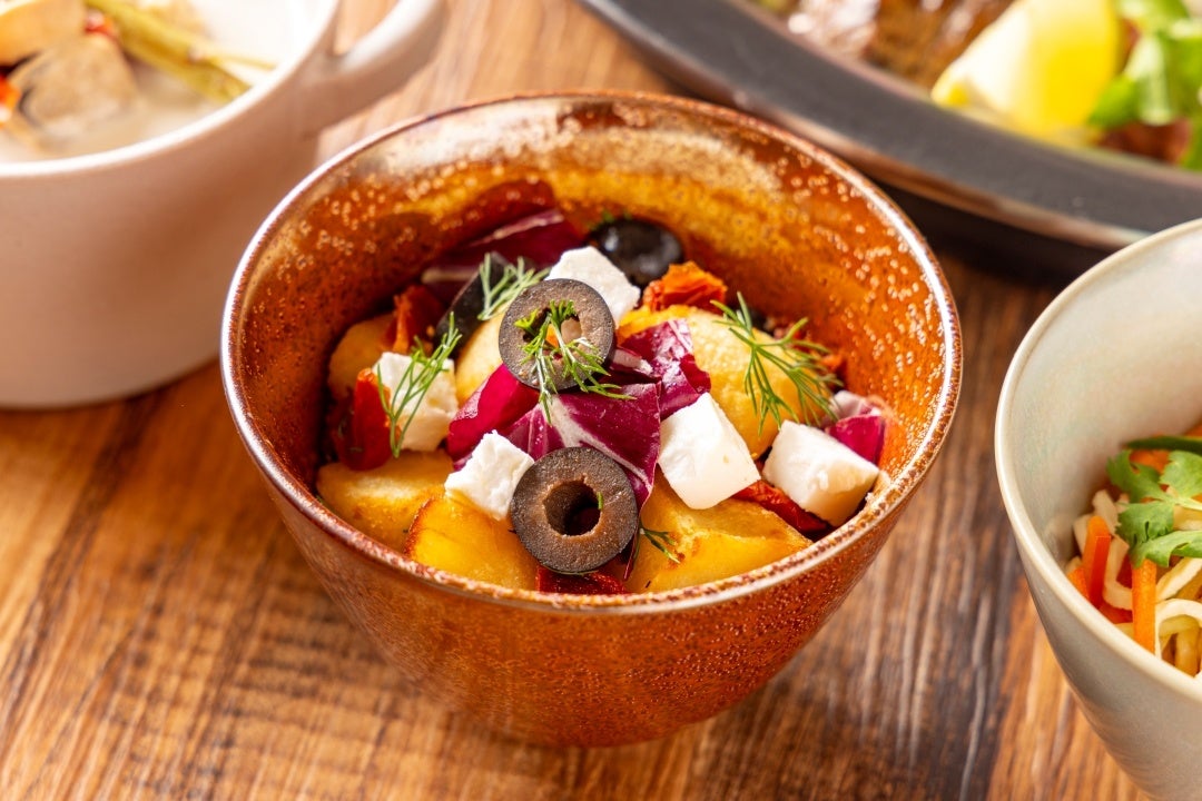 ポテトサラダに、フェタチーズやハーブ、ドライトマトをふんだんに使用し、さっぱりとしたギリシャ風にサラダに仕上げました。