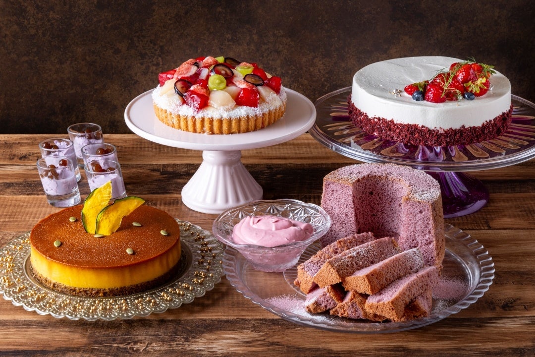 「レッドベルベットケーキ」、「紫芋のシフォンケーキ」、「秋のフルーツタルト」、「パンプキンプディング」など、季節を感じるスイーツをお好きなだけ。