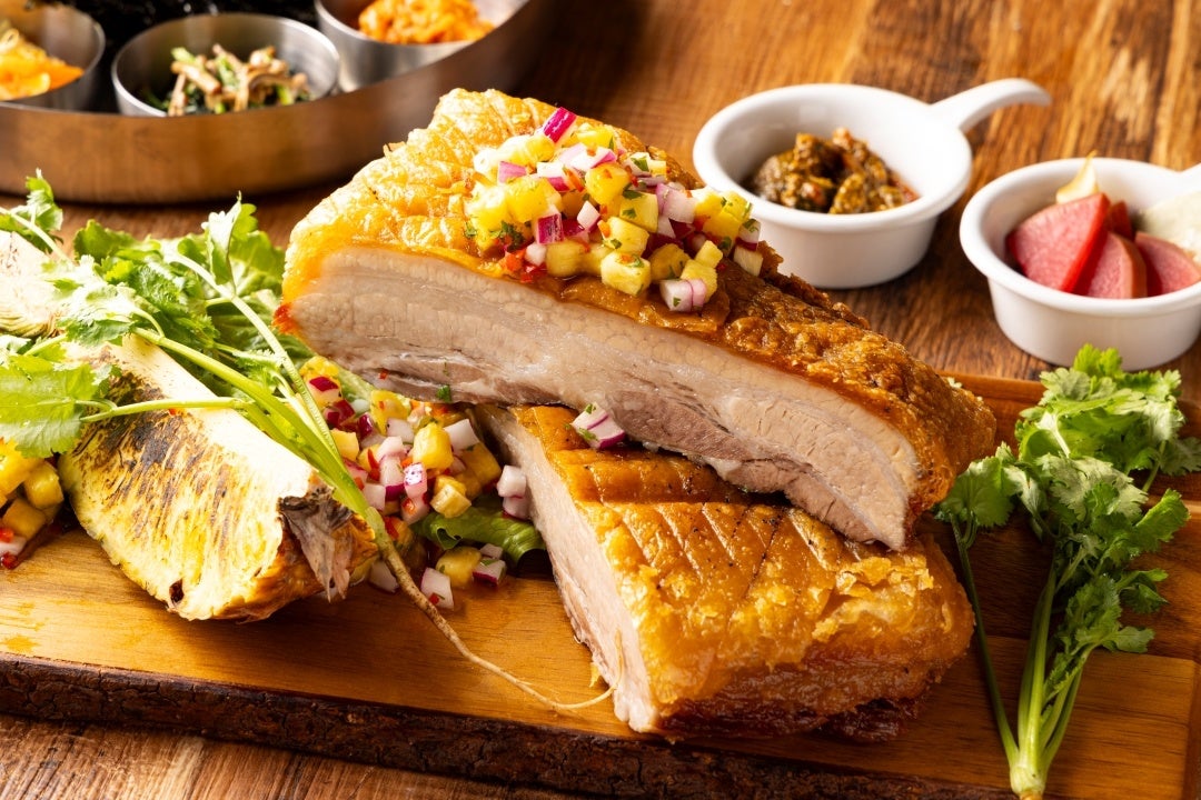 柔らかくじっくり塩ゆでし塊のまま豪快にカリカリに表面を香ばしく揚げました。やさしい酸味のタマリンドベースのパイナップルサルサと共に。