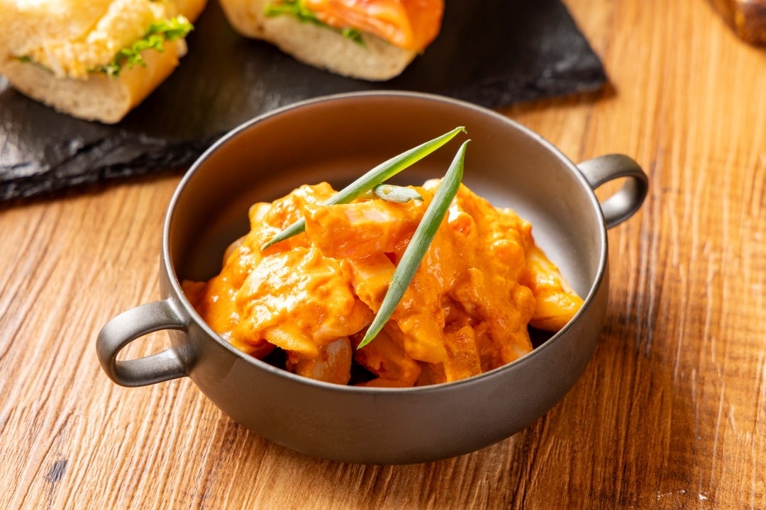 トマトクリームソースにコチジャンを加え、ロゼ色のクリーミーで甘辛い仕上がりに。
