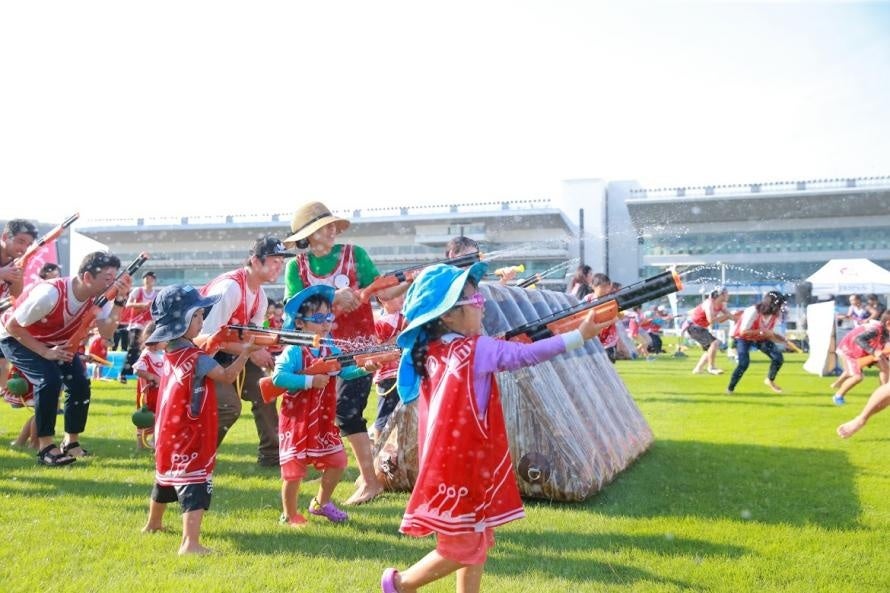 本イベントは2軍に分かれて、火縄銃型の水鉄砲で撃ち合うびしょ濡れ必至のウォーターバトルです。現在の横須賀市衣笠町で起きた平安後期の戦い“衣笠城合戦”の歴史を再現したストーリーで、特別ゲストとして自衛隊が参加し共に戦うことができます。