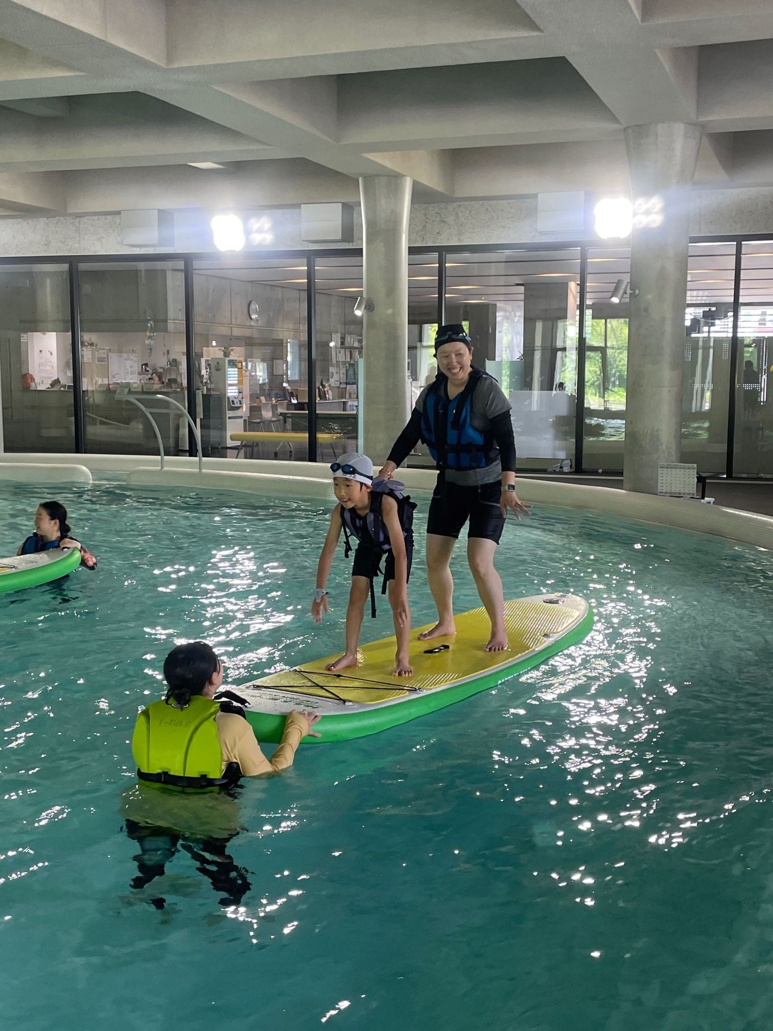 1時間のプログラムの中では、プールの特性を生かしたである「水流」を活用した水中運動から始まり、安全管理・啓蒙の観点から本格的なライフジャケット(PFD)もを着用して活動を行ないました。最後には、親子でSUPの上に乗り、バランスをとる運動や、リレー形式でSUPを操作しながら身体を動かす機会を提供しました。