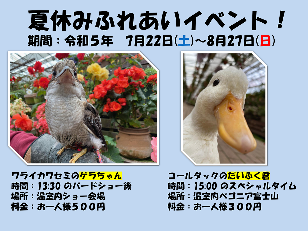 今年の夏のふれあいは、バードチームの今年の新人ワライカワセミのゲラちゃんと、推しファン多数のもちもちコールダックホワイトだいふく君の登場です。
