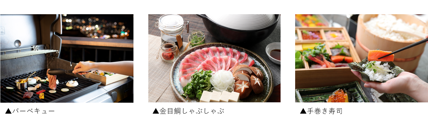 お食事のメインとなるお料理を3種類ご用意しました。旨味あふれる3種のお肉や新鮮な海鮮、種類豊富なお野菜などをセットにした「バーベキュー」、旨味たっぷりのお出汁と特製ぽん酢でいただく「金目鯛のしゃぶしゃぶ」、10種もの具材で熱海近海の幸を堪能する彩り豊かな「手巻き寿司」。大切な方々との賑やかなひとときをご堪能ください。