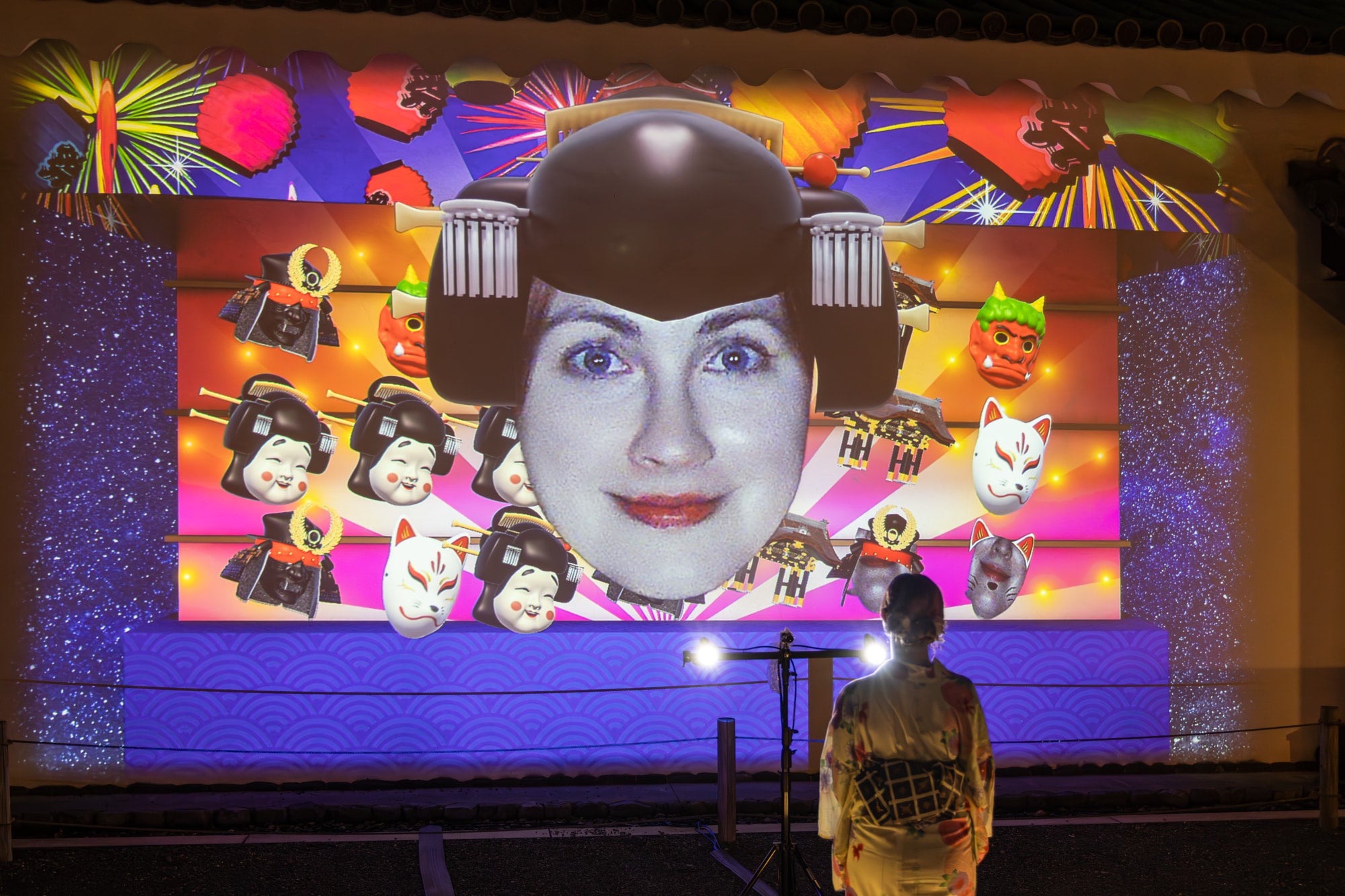 2つ目は、本イベントの目玉となる京都最大級のプロジェクションマッピング花火大会。色鮮やかな万華鏡花火が夏の夜を彩ります。目の前の内堀いっぱいに映し出され、水面に反射する花火は圧巻。来場者の「たーまやー!」の掛け声と手拍子に連動して演出が変化するインタラクティブタイムは、会場一体となってお楽しみいただけます。