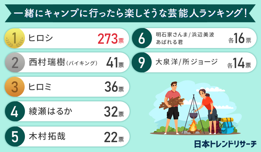 キャンプ好きで頼りになりそうな芸能人や、一緒に居て楽しかったり和んだりする芸能人など、実にさまざまな芸能人がランクインしていました。