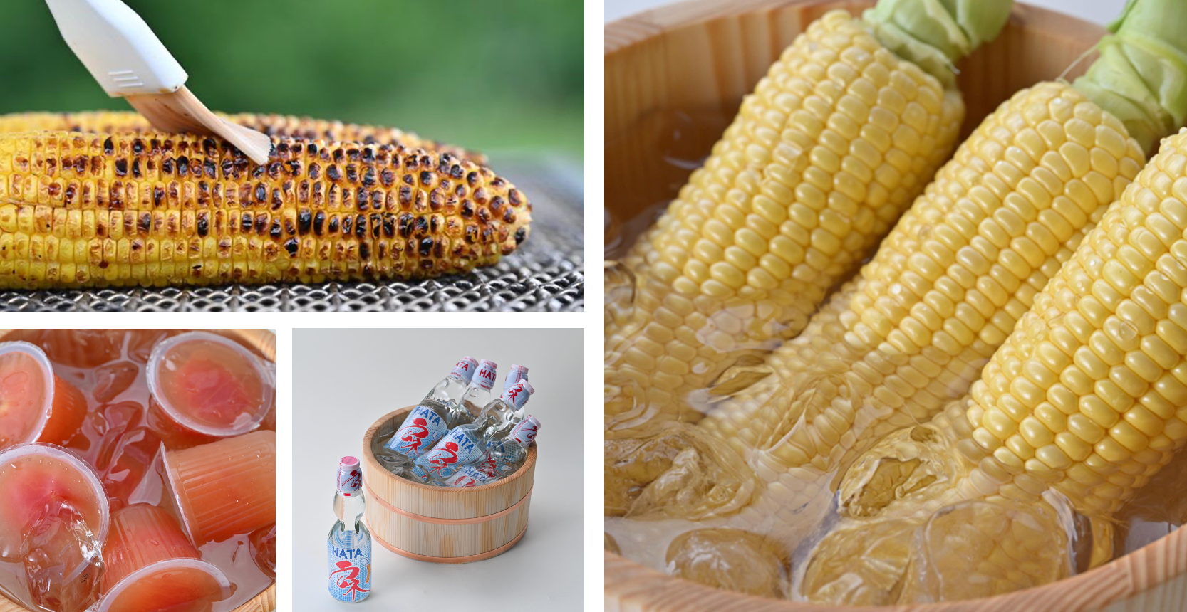 今年の夏は、おためしもろこしセット(生、焼き、冷やし)や夏らしくラムネや冷たい飲料水をご用意。