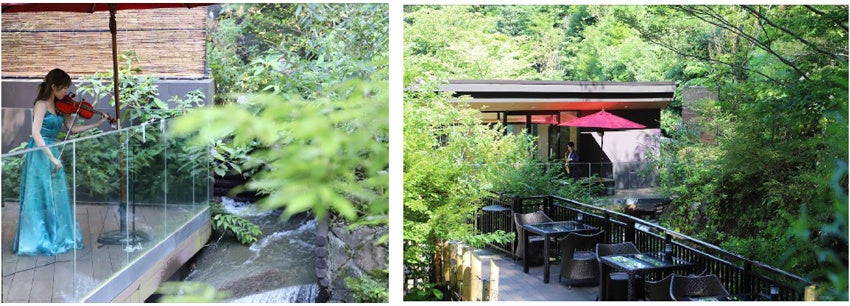 渓谷庭園を流れる川から響く水の音や虫の声と、豊かな演奏がともに重なる、天悠ならではの夏の調べを感じながら、優雅なひとときをお過ごしください。