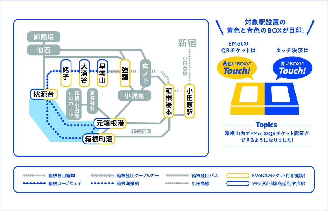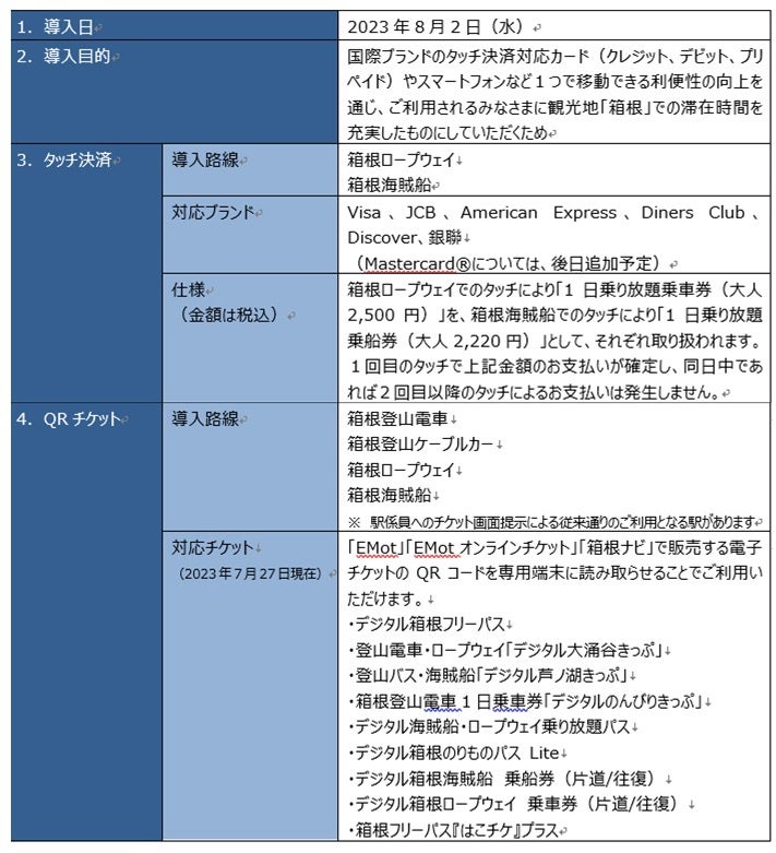 箱根ロープウェイと箱根海賊船に導入するタッチ決済は、往復利用いただくことの多い訪日旅行者の傾向を捉え、タッチにより1日乗り放題乗車(船)券として取り扱われます。利用の都度精算するよりもお得に、利便性高くご利用いただけます。QRチケットは、箱根登山電車と箱根登山ケーブルカーにも導入し、箱根山内広域でご利用いただけることから、お客さまに便利でスムーズな旅の時間を提供します。