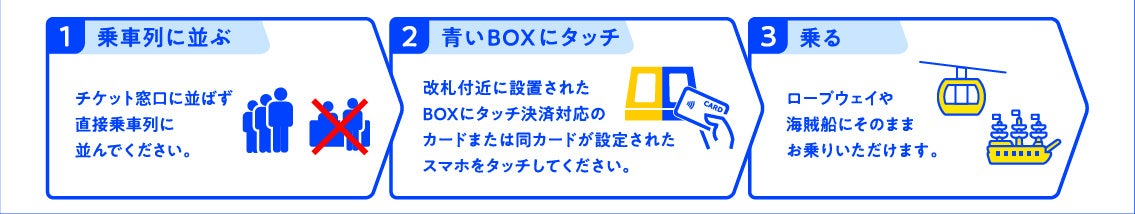 ※2:タッチ決済は、ご利用運賃分の精算ではなく、1日乗り放題乗車券・乗船券として取り扱われます。当日初回のタッチでロープウェイでは2,500円が、海賊船では2,220円がご利用額として認証され、当日中であれば2回目以降のタッチによるお支払いは発生しません(ご乗車(乗船)にはタッチが必要です)。なお、タッチ決済ご利用後の払い戻しは出来ません。