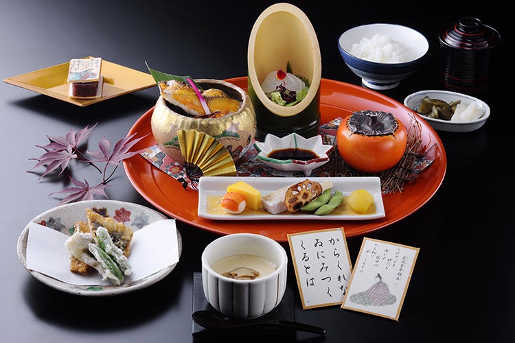 在原業平作「ちはやぶる 神代も聞かず竜田川 からくれなゐに水くくるとは」の歌にちなみ、「鰆紅葉焼き」や脂がのった「秋刀魚竜田揚げ」が秋の献立の主役。サーモン百合根寿司の紅色や、栗甘露煮の黄色で、山を彩る紅葉を表現しました。ほくほくの里芋や薫り高い松茸など秋の味覚を様々に。「日本料理 おおみ」の料理長の遊び心をお楽しみください。
