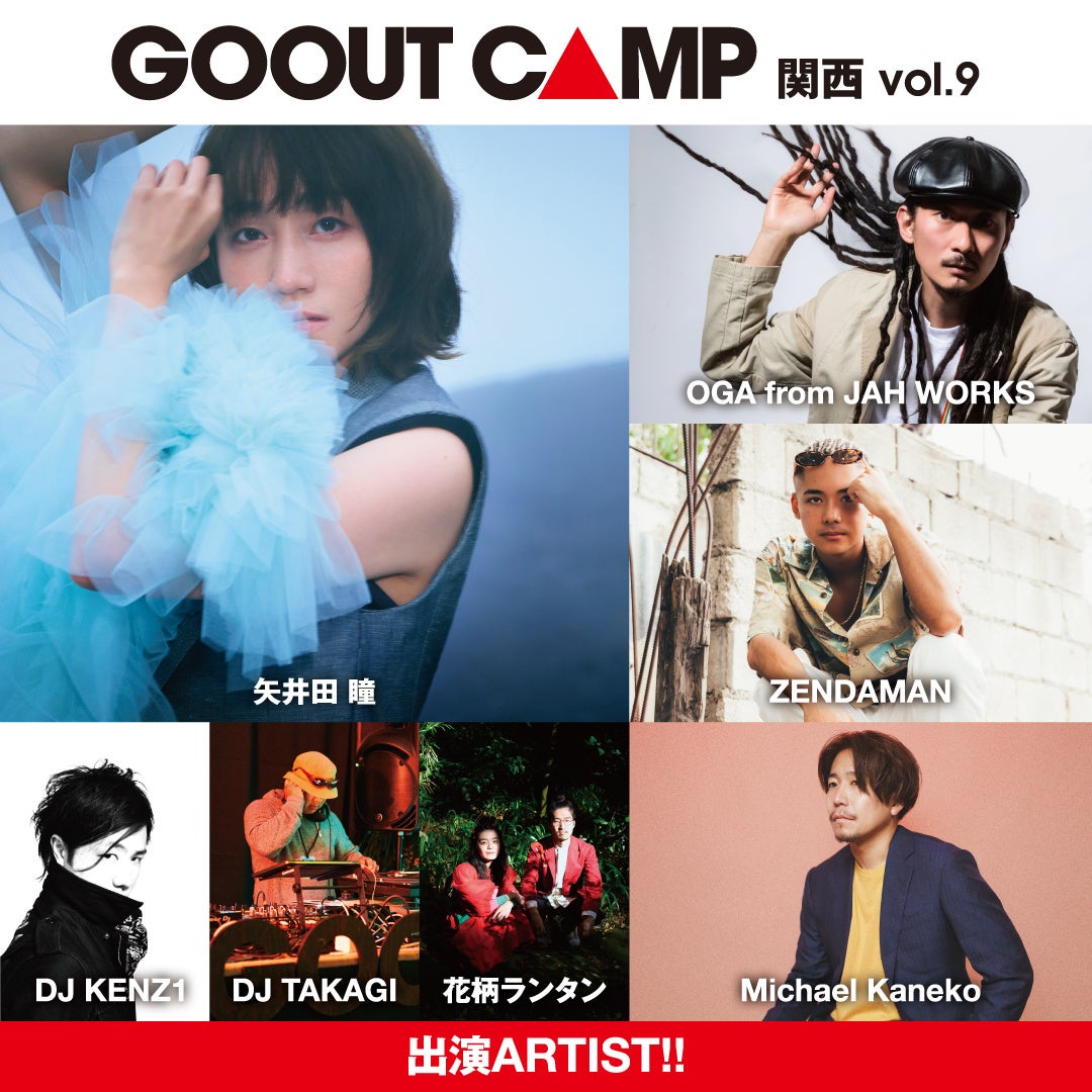 ギター女子の先駆け的存在である”ヤイコ”こと「矢井田 瞳」や、大阪の老舗レゲエサウンドシステム“JAH WORKS”所属の「OGA from JAH WORKS」、今最も多くの注目を集める逆輸入のディージェイ「ZENDAMAN」、卓越したソングライティングと圧倒的なパフォーマンスが注目を集め、プロデューサーとしても著名アーティストやアニメの劇伴音楽も手がける「Michael Kaneko」、GO OUT CAMP関西のレギュラーDJ、「DJ KENZ1」と「DJ TAKAGI」、そして今回新たに追加となった、ギターいっぽん歌声ふたつの最小編成での表現に挑戦している音楽デュオ「花柄ランタン」らが出演する。