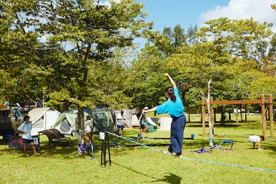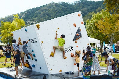 BOLDプロデュースのボルダリングウォールは、4面の角度によってそれぞれの難易度を楽しむことができるユニークなウォール。ワンコインで体験できるEXALER Slackline Professionalsプロデュースのスラックラインパークも登場。