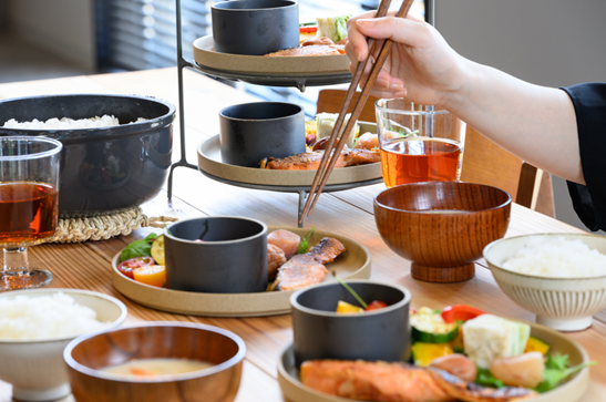 バーミキュラライスポットで提供する近江米や、地場野菜のお味噌汁と発酵食品を取り入れたからだに優しい和食メニューの朝ごはんをお召し上がりくださいませ。