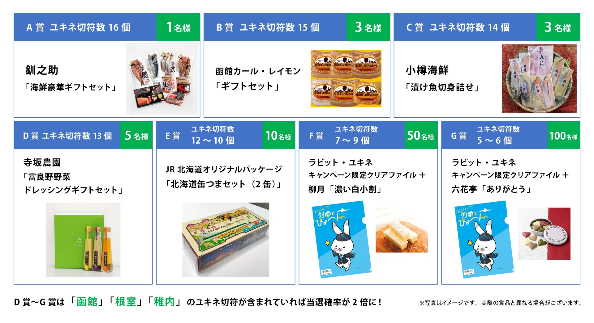 ※D賞〜G賞は「函館」「根室」「稚内」のユキネ切符が含まれていれば当選確率が2倍になります。