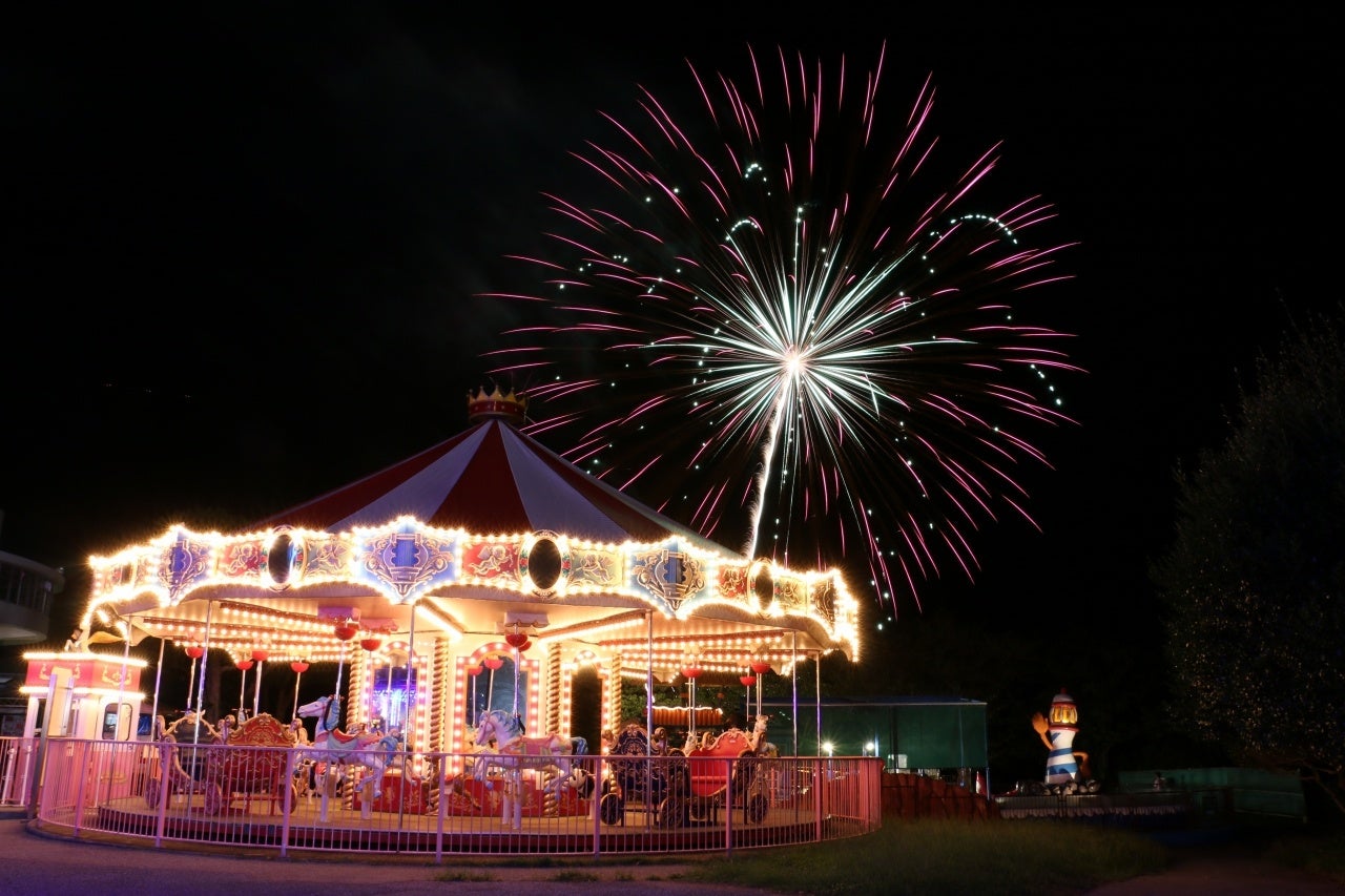 サマーナイトファームの目玉である打ち上げ花火は、花火鑑賞エリアよりも低い山の谷間から打ちあがるので目の前で花開き迫力満点!ほかにも、夕方限定の動物ふれあいイベントや、キラキラにライトアップされた「ナイト遊園地」、ジンギスカンや自家製ソーセージの炭火焼などの牧場グルメ、などお楽しみ盛りだくさんです。