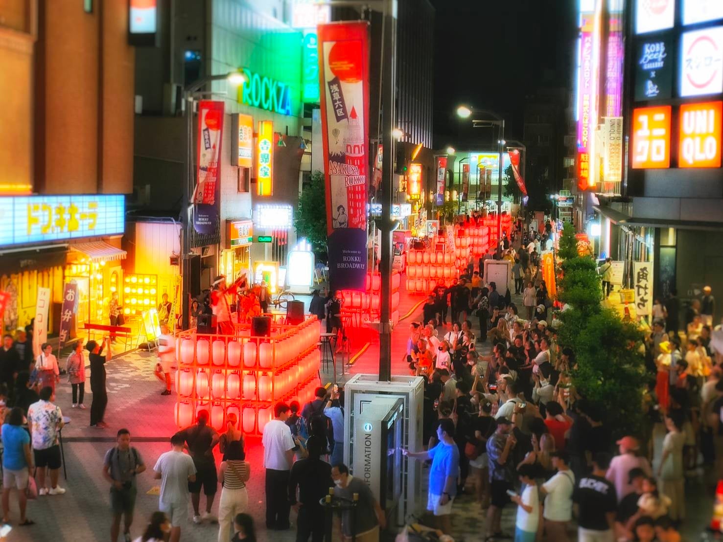 「浅草六区ブロードウェイ」をメイン会場に開催される「浅草夜祭」。光、音楽、食、お酒、芸、人力車のすべてを楽しむことができます。