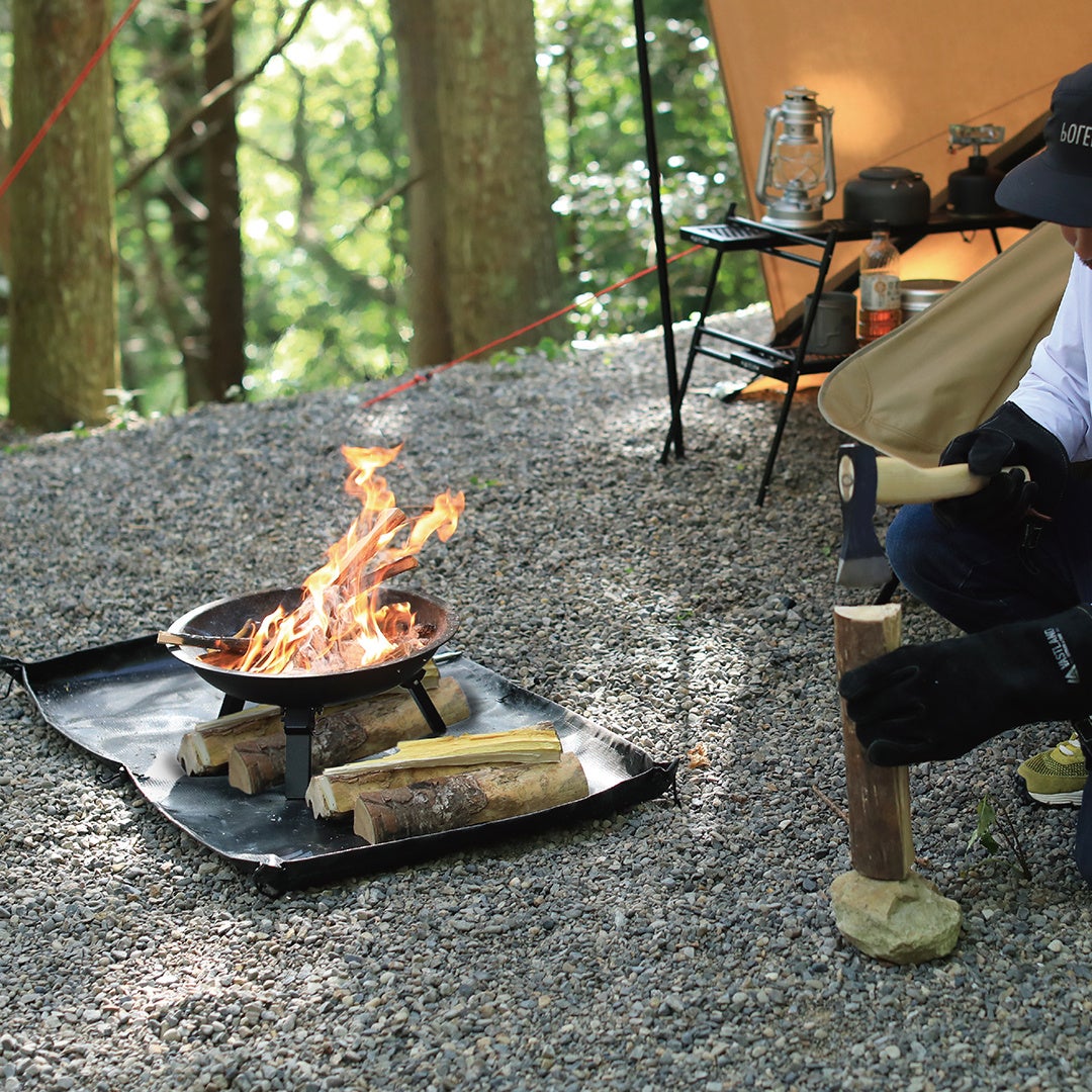 シートのふちが立ち上げられ、灰や火の粉の飛散を防ぎ、地面への延焼やダメージを軽減する焚き火シート。