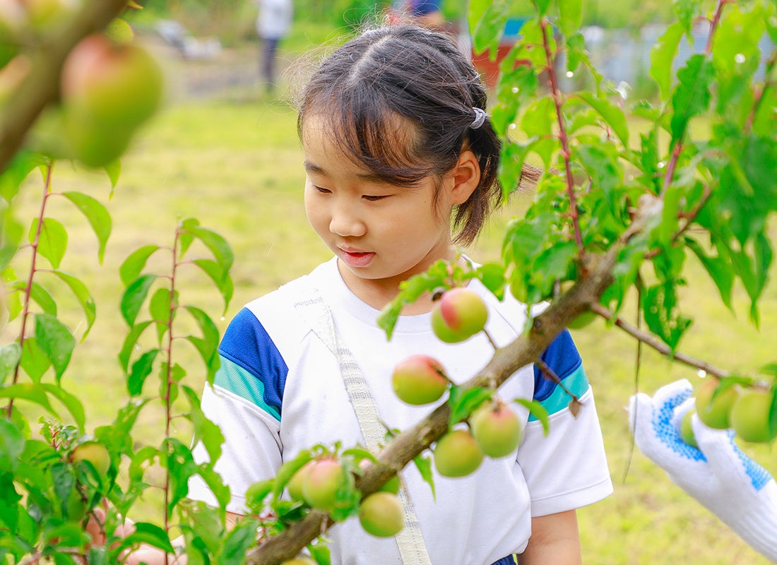 教材「紅映の青梅」を収穫する様子(福井)