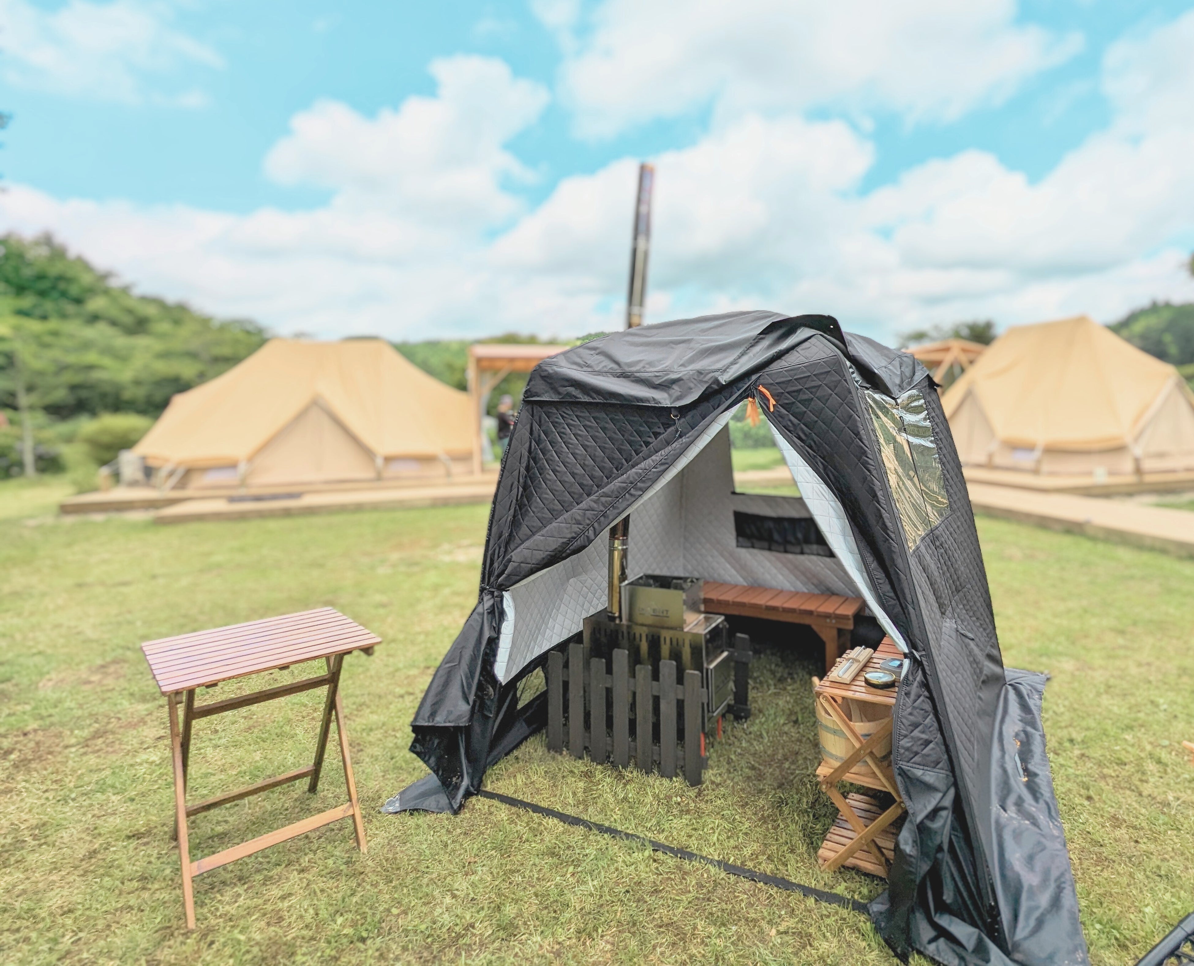 三瀬のみどりの中でカラダもココロも『ととのう』体験をお楽しみいただけるよう、1日2組限定で7月26日(水)よりテントサウナ体験を開始しました。お好きな香りのアロマウォーターで、セルフロウリュを行えば、テント内はたちまち100℃まで上昇。体を芯からしっかりとあたため、三瀬の冷たい地下水や、ひんやりとした心地よい風の外気浴で、自然に囲まれたアウトドアでのととのいをお楽しみください。