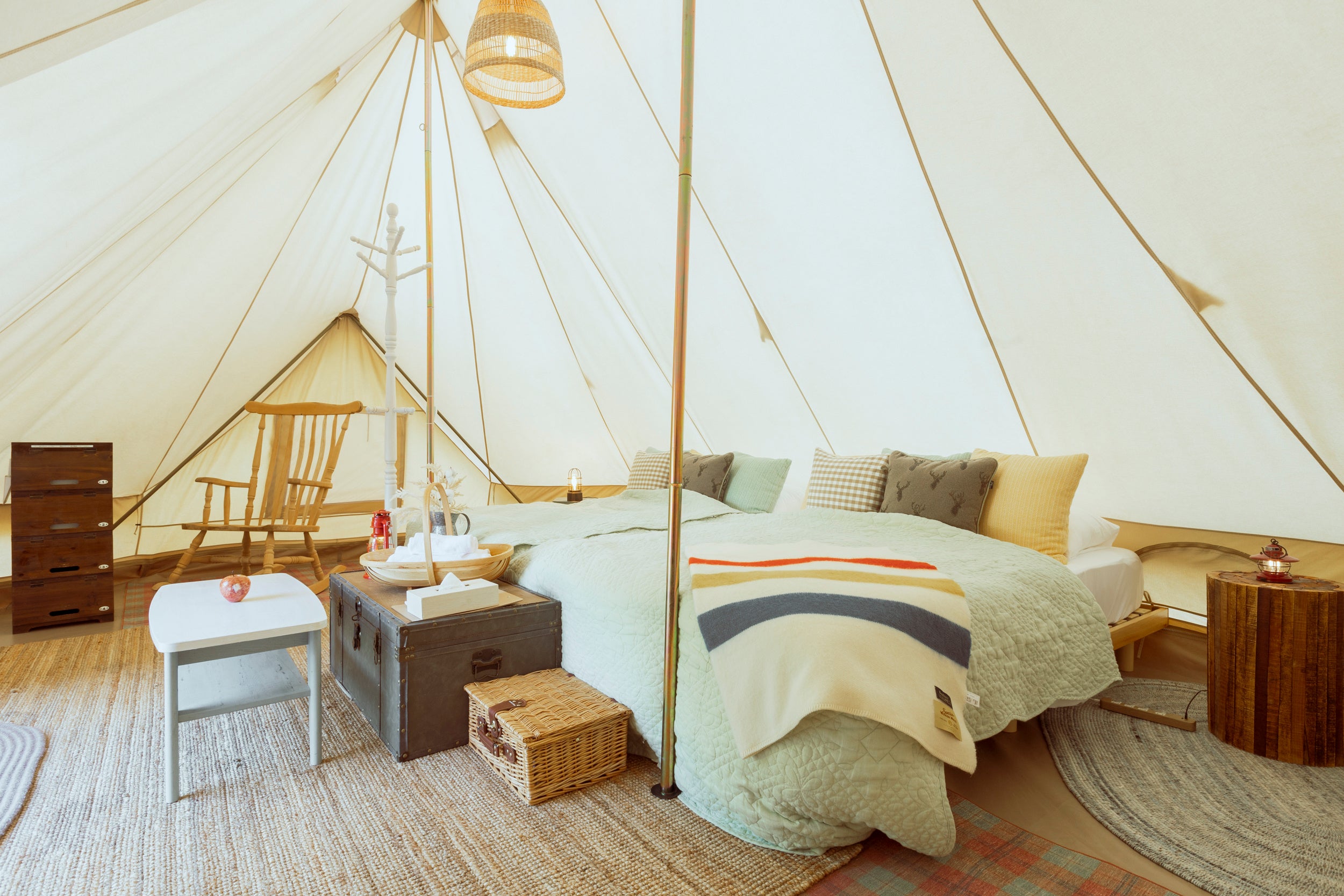 テント内はエアコン、コンセント、ふかふかのベッド、各種アメニティなどグランピングとしての快適な設備を整えています。お部屋は南京錠での施錠ができるため安心して、ごゆっくりとおくつろぎいただけます。