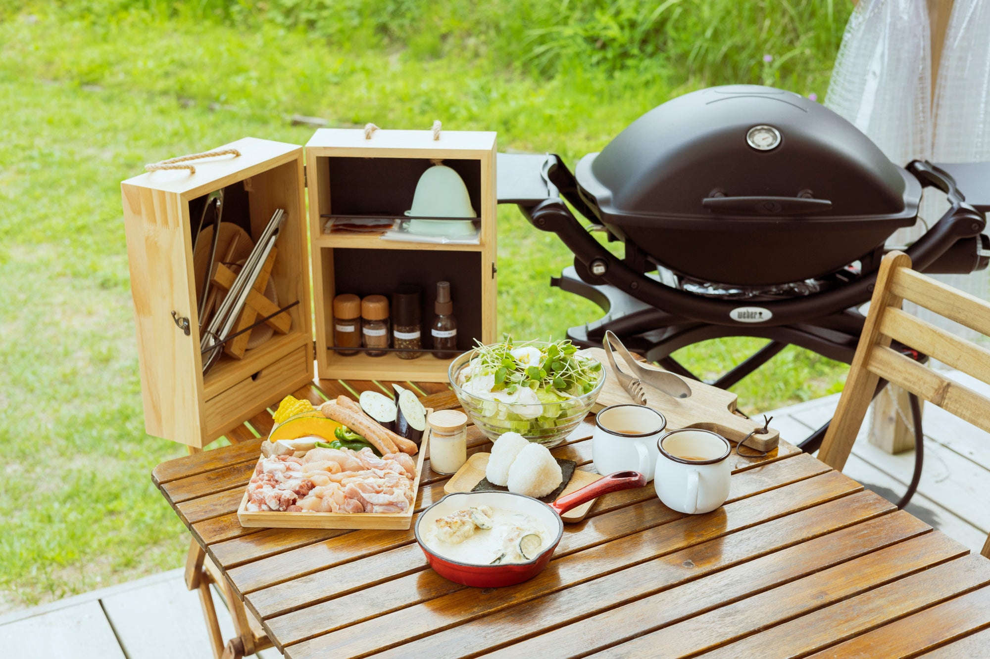 BBQはテント前の屋根のついたウッドデッキにて、BBQ本場アメリカweber社のガスグリルで夕食をお楽しみいただけます。着火や準備、片付けなどは全てスタッフで行いますので、はじめての方でも心配不要。調味料・お皿もすべて用意しているため、事前に食材や食器を持ってくる必要がないのもうれしいポイントです。