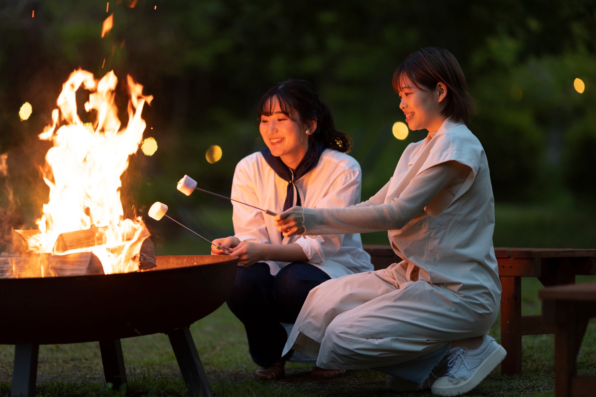 毎晩、地元の間伐材を活用した薪で焚き火を開催しています。BBQの後は、お渡しする大きなマシュマロを炙ってトロトロのスモアをデザートに。雨の日でも、大きなシェードの下で焚き火を行うため問題なくお楽しみいただけます。