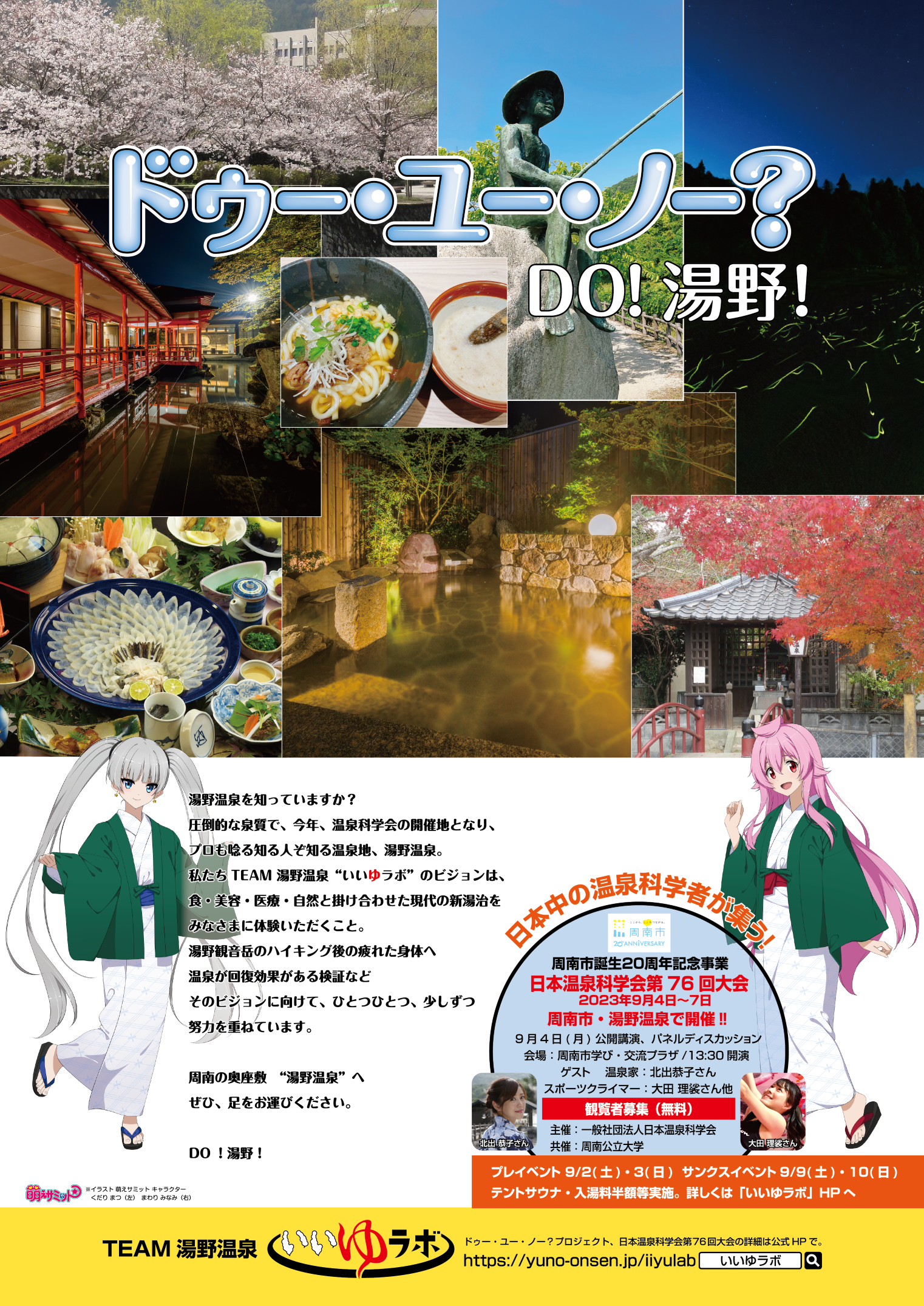 周南市、周南公立大学とともに、周南市の観光を盛 り上げる観点からも「周南市誕生20周年記念」として、「日本温泉科学会第 76 回大会」を周南市および湯野温泉で開催致します。
