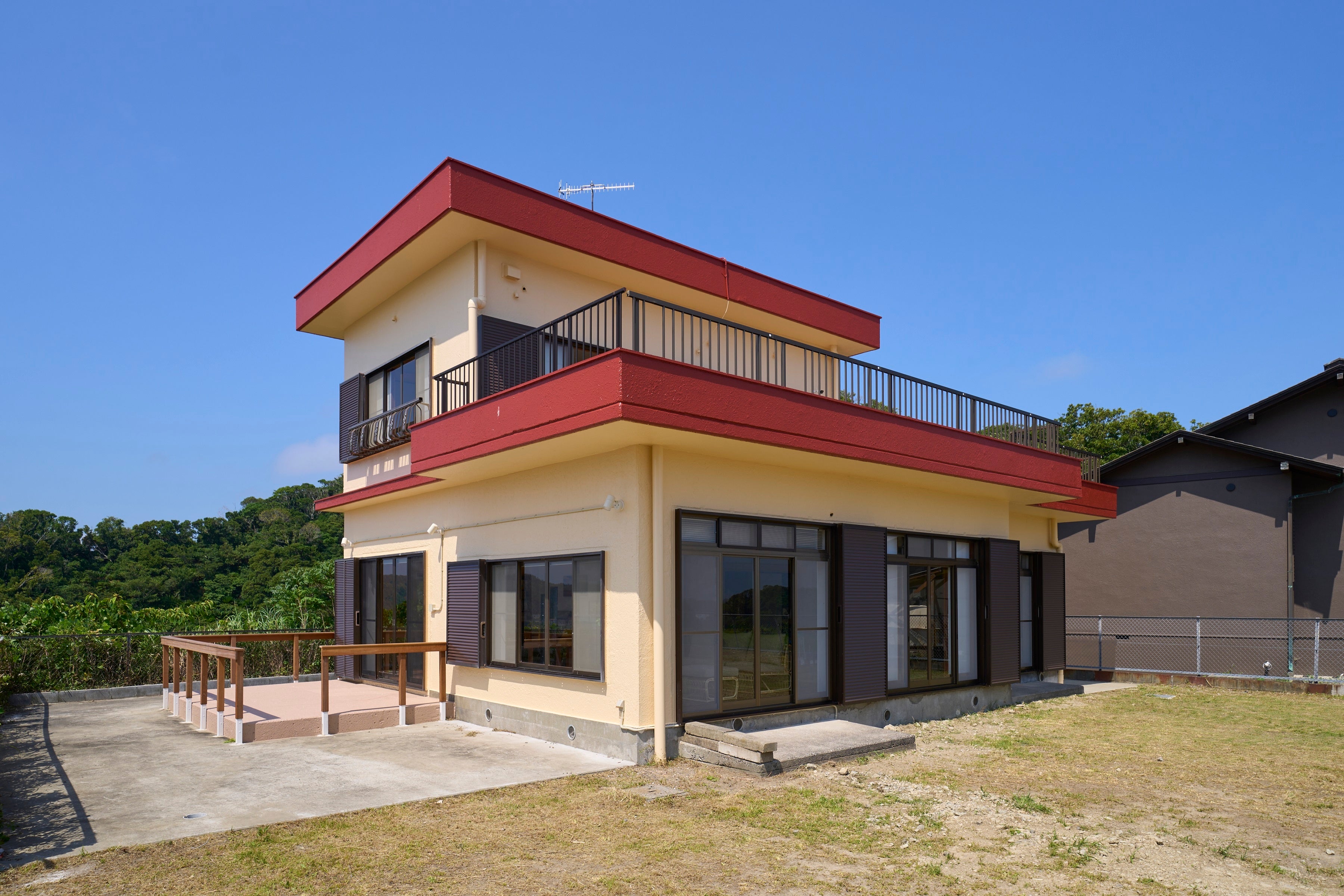 鉄筋コンクリート造2階建(3LDK)のフルリニューアルされた室内は、南欧的な白を基調としたシーサイドリゾートらしいデザインで、開放的な広いリビングからは海が望めます。寝室は、洋室が1室(セミダブル×2)と和室が2室(布団×2・布団×3)の計3室で、最大7名様までの利用が可能です。また、2階の50㎡超の大型ルーフテラスからは富浦沖が一望でき、空と海のコントラストが織り成す絶景を独り占めできます。さらに、1092㎡の広大な庭でバーベキューが楽しめる設備もあり、富浦ICおりてすぐにある道の駅で買える房総の食材をご堪能いただけます。