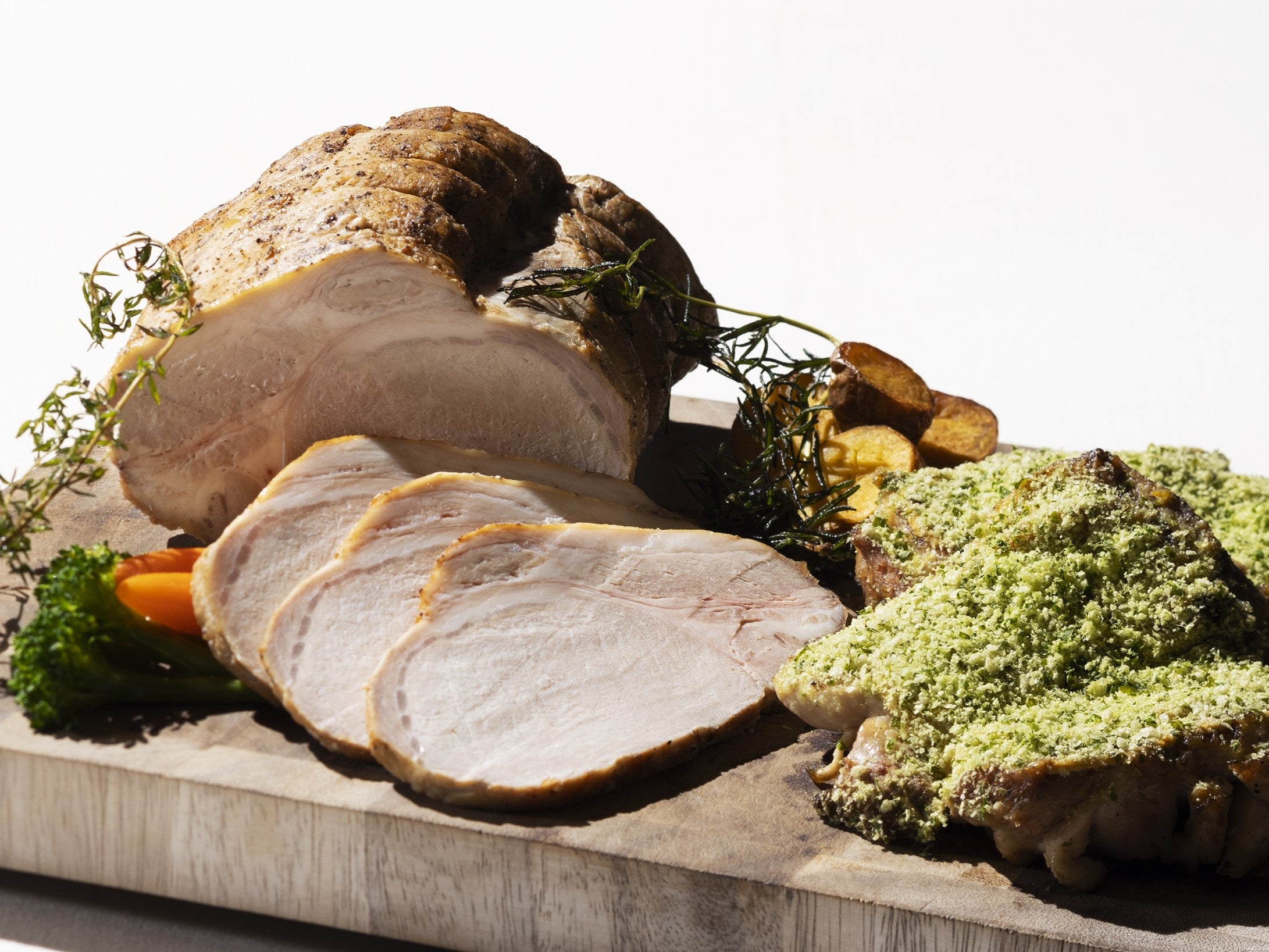 香草でマリネした豚ロース肉の低温ローストと夏野菜