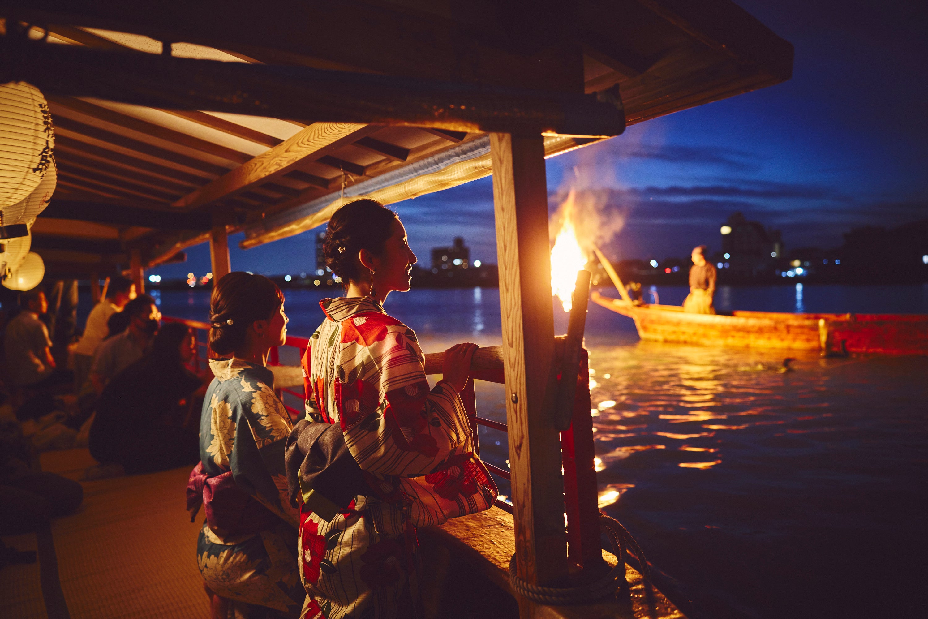 鵜飼船に乗った鵜匠が鵜(海鳥の一種)を訓練し、川魚を捕らせる古代漁法です。首に手縄をつけ、鵜匠の巧みな手縄さばきに促され、鵜たちは水中へ潜り、鮎をはじめとする川魚を捕らえます。「ホーウホーウ」と威勢のよい鵜匠のかけ声、水中と鵜匠の手元を何度でも行き来する鵜。ライトアップされた国宝犬山城を背景に、幻想的な歴史絵巻が目の前でくり広げられます。 木曽川の波の音に包まれた癒しの時間はタイムレスな旅とともに伝統的な日本文化体験の美しい和の世界を体感することができ、日常を離れての贅沢な時間をお過ごしいただけます。夕食には、鮎や和牛すき焼き、地元で取れた新鮮な野菜を使った天ぷらなど、素材の旨味がたっぷりと詰まったネイバーフッドメニューをお楽しみください。