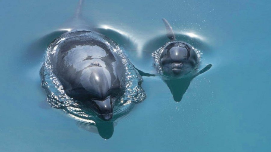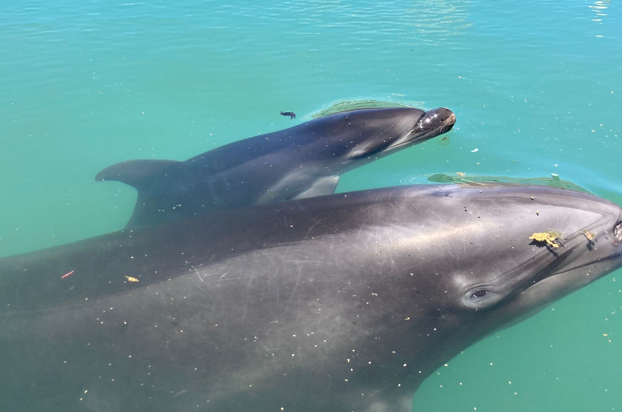 赤ちゃんイルカのスラは、他の仔イルカに負けないくらい元気な男の子で、お母さんイルカのシュガーと一緒に嬉しそうに泳いでいます。