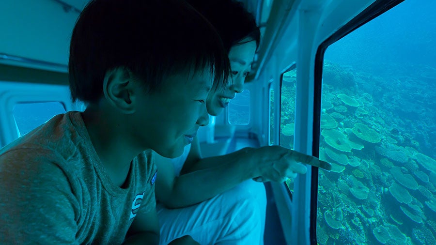 高速半潜水艇に乗り、沖縄本島で最も美しいと言われるサンゴ礁を、水中展望室からお楽しみください。色とりどりの熱帯魚が泳ぐサンゴの海に到着後、キャビンを約1.2m海中に沈めます。泳ぎが苦手な方や小さいお子さまもダイバー気分で海中の世界へ(40分/大人1,500円/子ども800円)