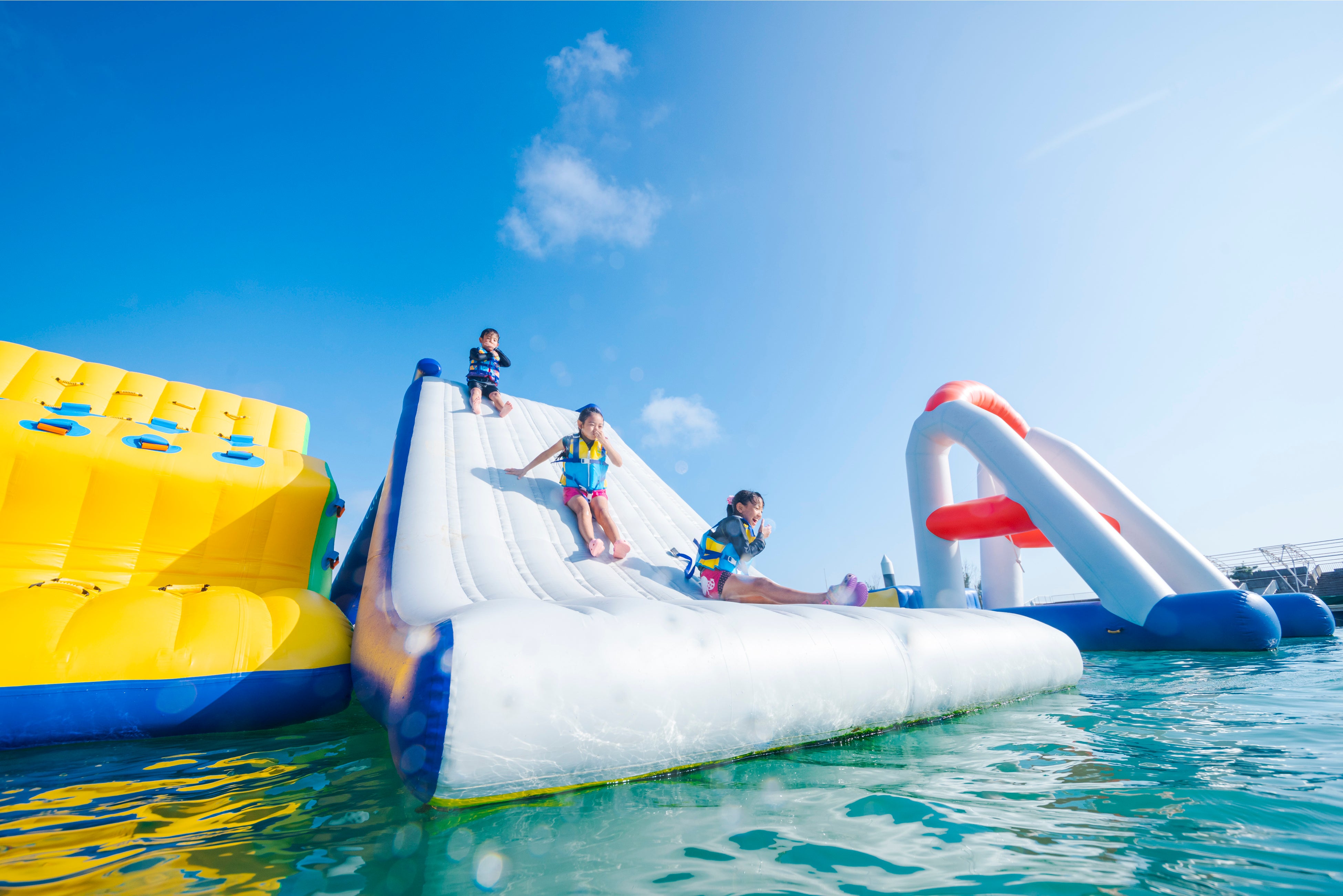 沖縄の海の上で、いろいろな遊具と遊ぼう♪すべり台にトランポリン、ターザンロープ、陸ではできないアクティブな動きもできちゃうかも。お子さまと一緒に楽しめる、おすすめの海上アスレチックプログラムです。