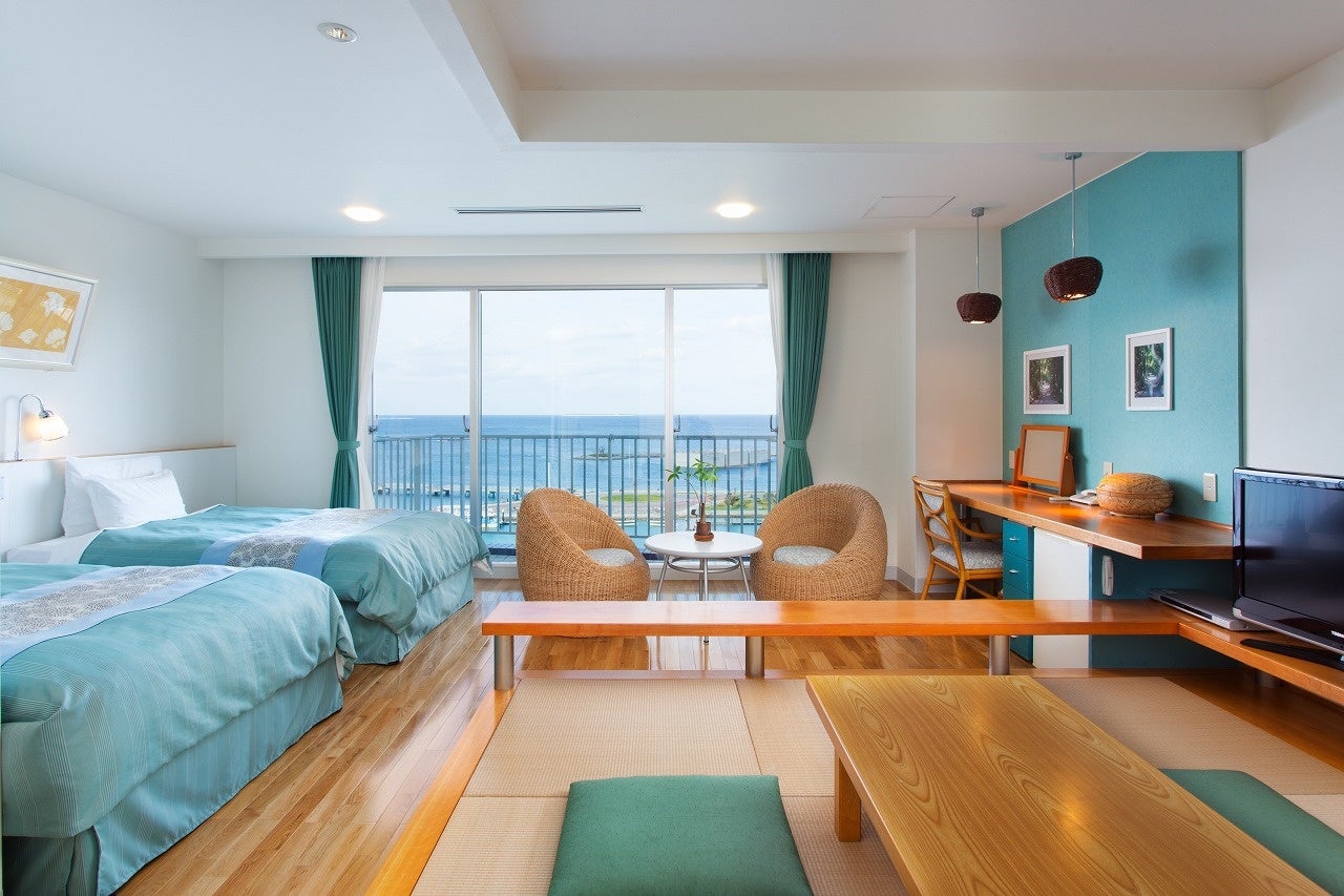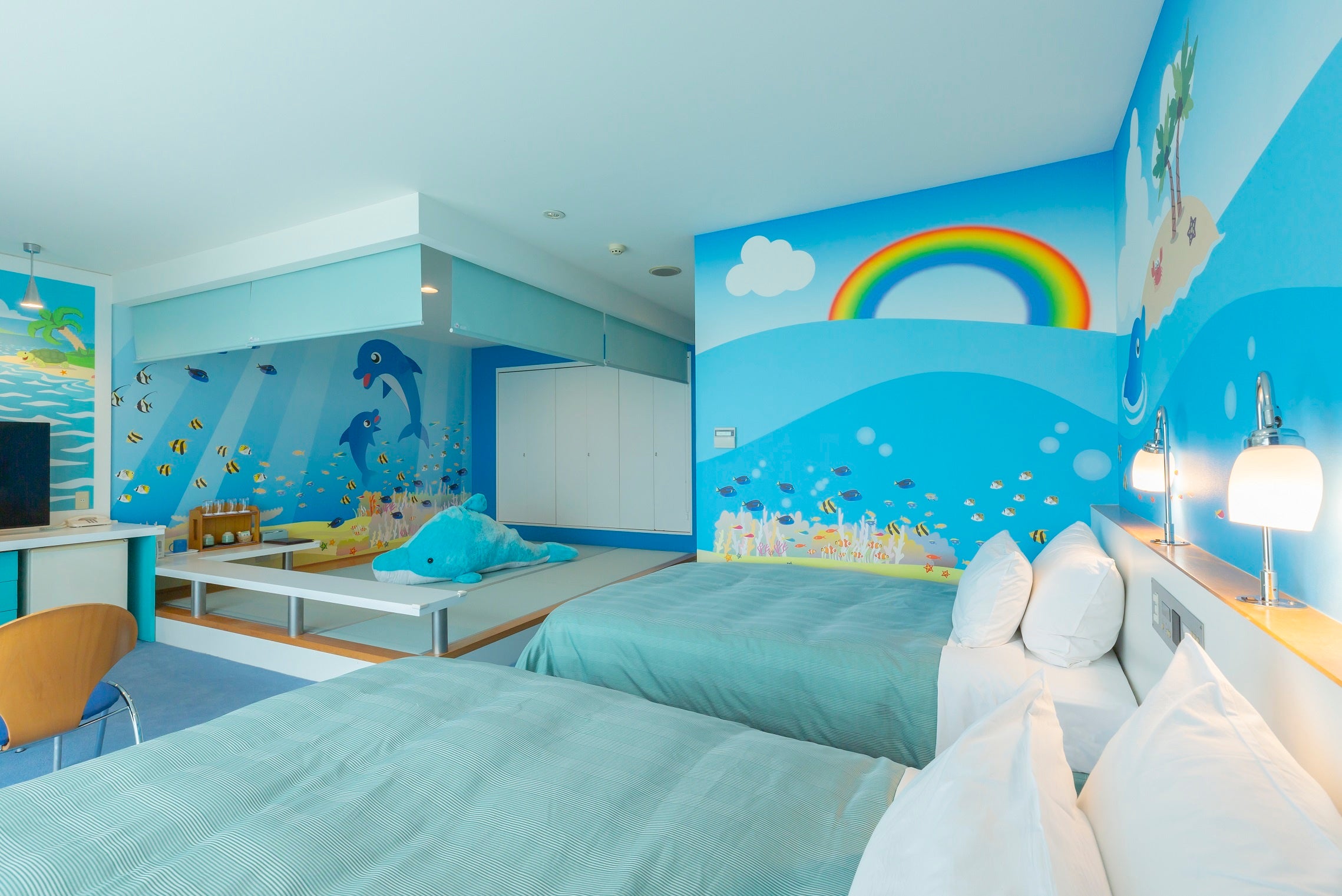 客室に広がる青い海の世界。イルカたちがお迎えします。バルコニーからは一面に広がる東シナ海と「もとぶ元気村」のイルカたちを眺めることができます。小さいお子さまも安心の和洋室(4室/最大定員6名/43.4㎡)